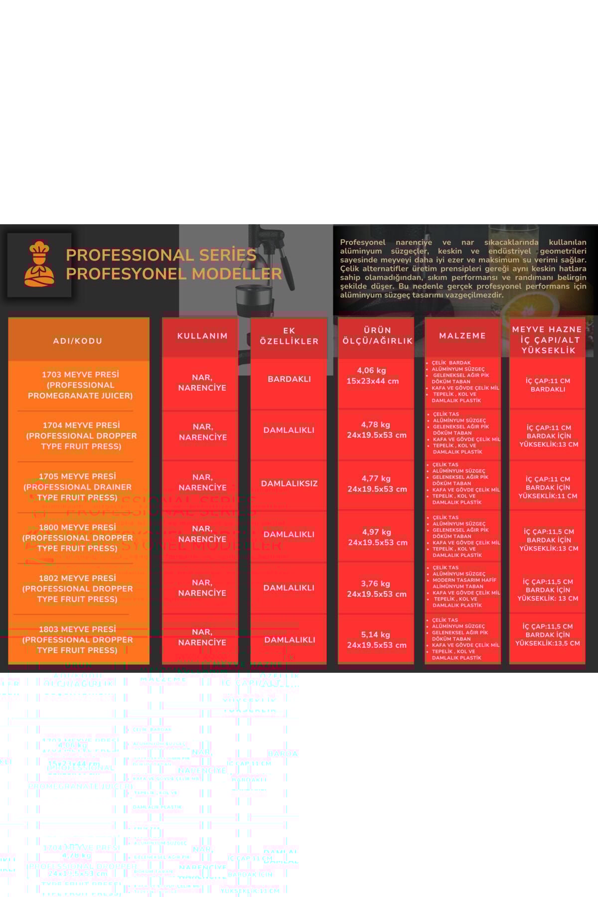 Ürün Ölçüleri: 14*19.5*41.5cm Ürün Ağırlığı: 2,40 Kg • Portakal, greyfurt, mandalina ve limon gibi narenciye meyvelerin sıkılmasında kullanılır.; • Paslanmaz çelik gövdesi sayesinde uzun ömürlü ve dayanıklı kullanım sunar.; • Özel açılı kremyer dişli sayesinde kolay sıkım sağlar.; • Üründe elektrostatik gümüş dövme desenli boya kullanılmıştır.; • Süzgeçler kısmında bulunan basamaklar sayesinde meyvenin parçalanması engellenir.; • Kolay temizlenebilir tasarımı ile hijyenik bir kullanım sunar ve mutfakta pratik bir deneyim sağlar.; • Mutfakta yerden tasarruf etmenizi sağlayacak kompakt boyutlarıyla mutfak tezgahınızda az yer kaplar • Metal yapısı sayesinde sıkma işlemi sırasında pratik, maksimum verimlilik sağlar ve meyve suyunun daha hızlı sıkılmasını sağlar.;