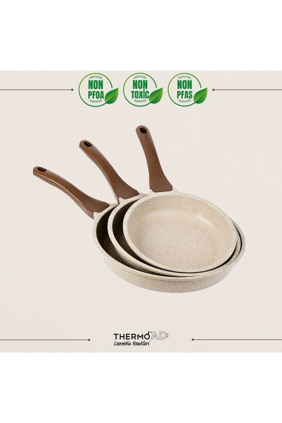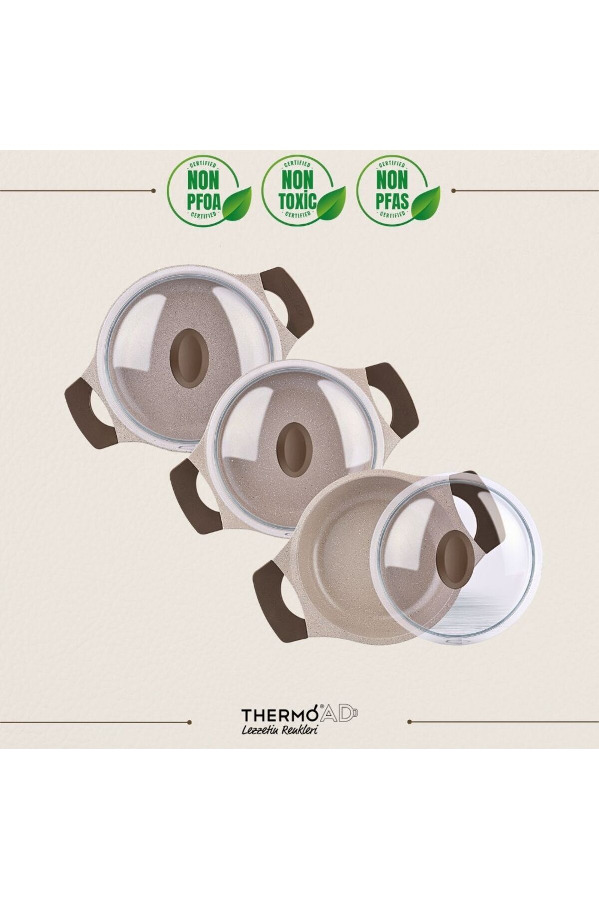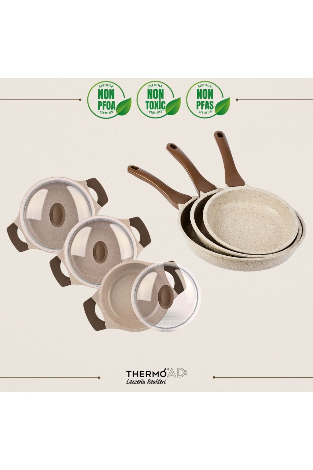 2 Yıl Garantili ThermoAD Alüminyum Döküm ürünlerimiz kısa sürede ısınması ile enerji tasarrufu sağlar.;Sıcaklığını uzun süre muhafaza eder. Isıyı eşit dağıtıp lezzetli ürünler hazırlamanıza yardımcı olur. Demir döküm ürünlere göre %40 daha hafiftir. Özellikle kimyasal dayanıklılığı yüksek bir malzemedir. PFOA ve PFAS İçermeyen ürünlerimiz Özel Granit Kaplıdır.; ;SET İÇERİĞİ :;18 cm Granit Kaplama Graneu Sahan;20 cm Granit Kaplama Graneu Sahan;22 cm Granit Kaplama Graneu Sahan;18 cm - 20 cm - 22 cm Cam Kapak;20 cm Granit Kaplama Tava Vizon ;24 cm Granit Kaplama Tava Vizon;28 cm Granit Kaplama Tava Vizon;Özel Granit Kaplama: ThermoAD ürün gamının tamamında yüksek dayanıklılık değerlerine sahip özel granit kaplama boyaları kullanılmaktadır.;Kullanım ve Bakım Bilgileri;• Kullanırken keskin, sert veya metal gibi materyaller (bıçak, çatal, metal kaşık, metal kepçe vs.) ile temas ettirmeyiniz.;• Temizlemek için sabunlu ılık su kullanınız.;• Sert temizleyicileri kullanmayınız.;• Çıkmayan lekeler için sıcak sirkeli su tavsiye edilir.;• Ürün boşken fazla ısıtmayınız Ürün boşken içinde yağ yakmamaya dikkat ediniz.