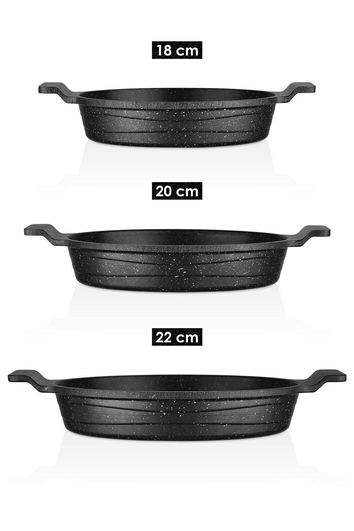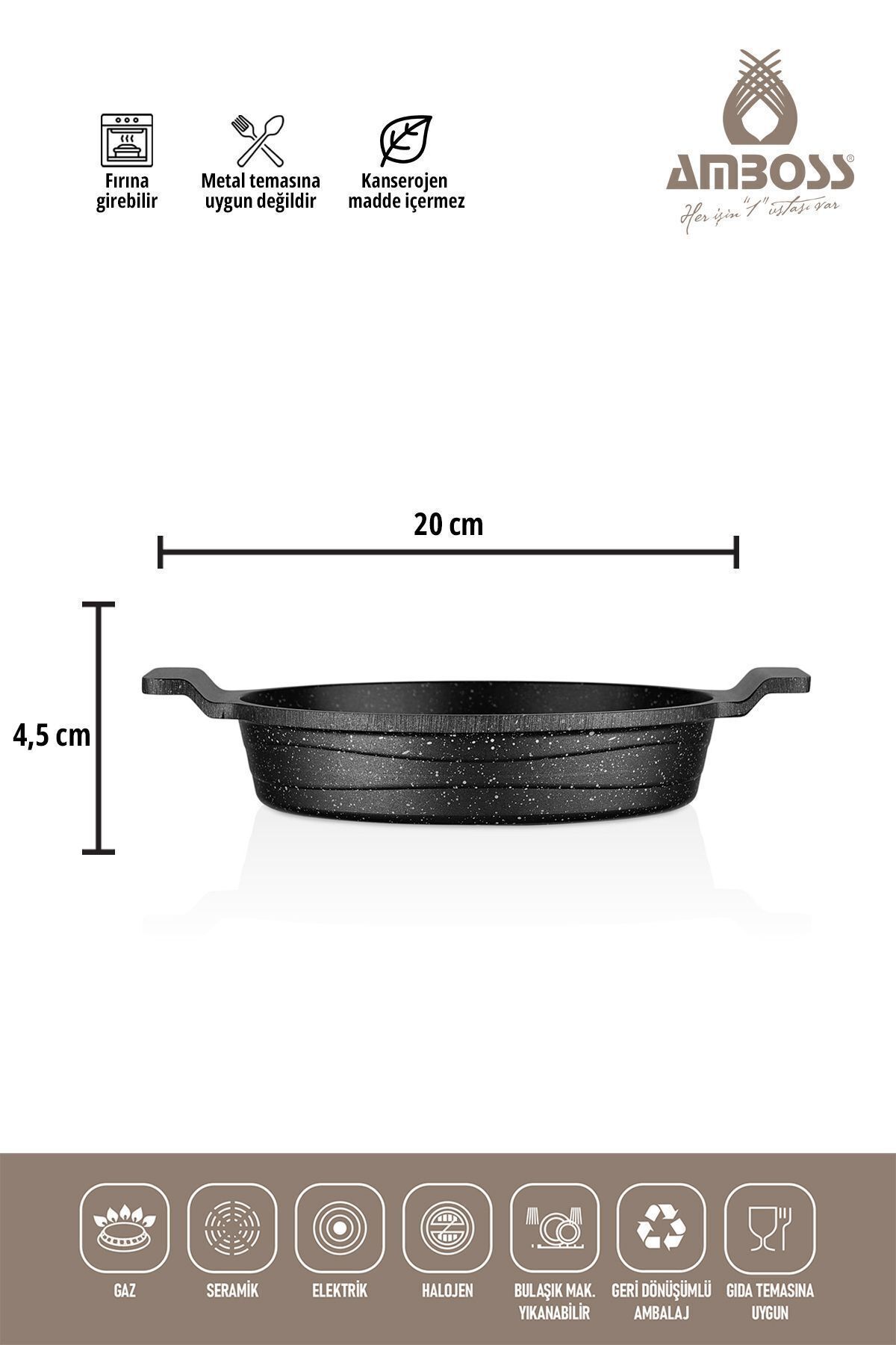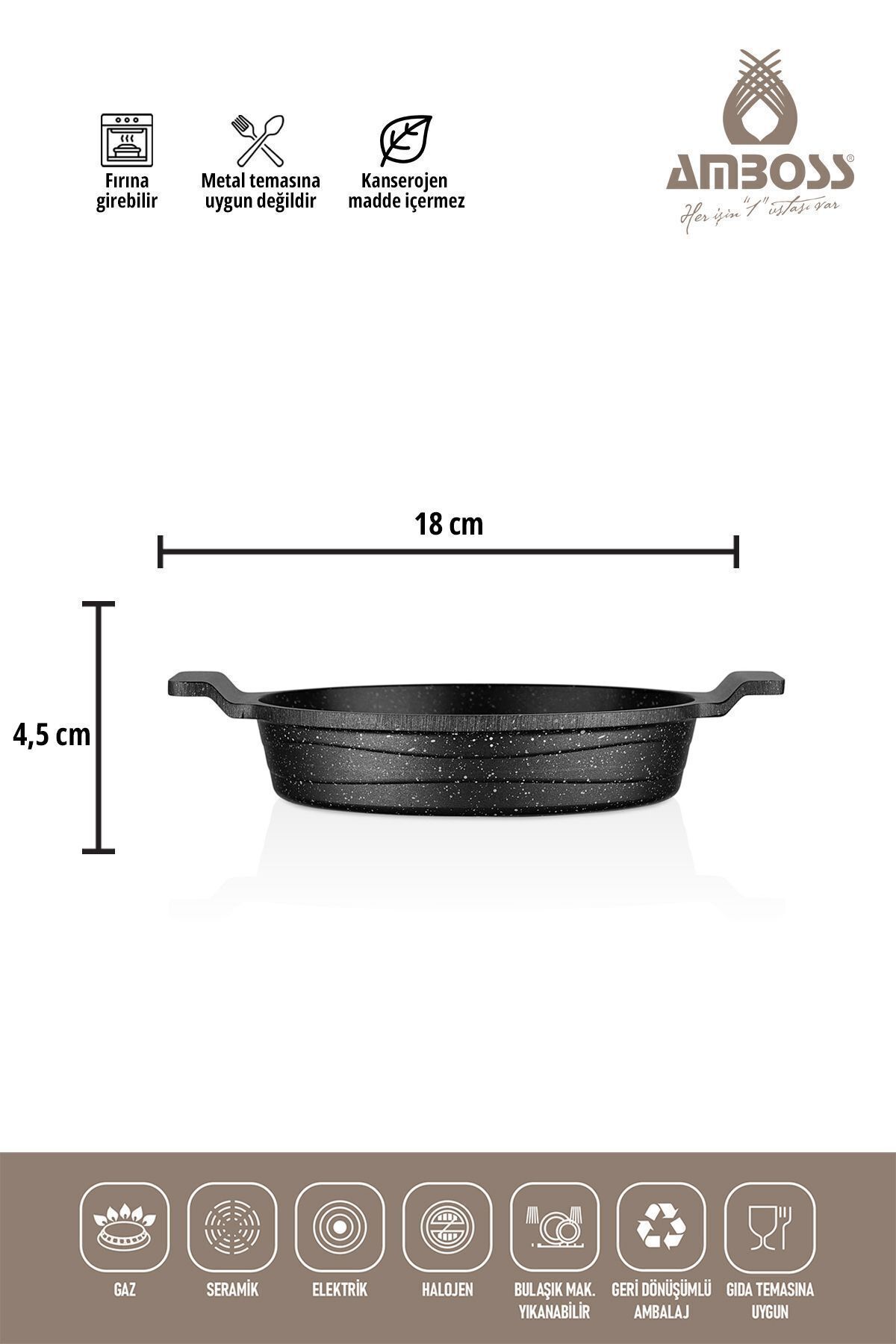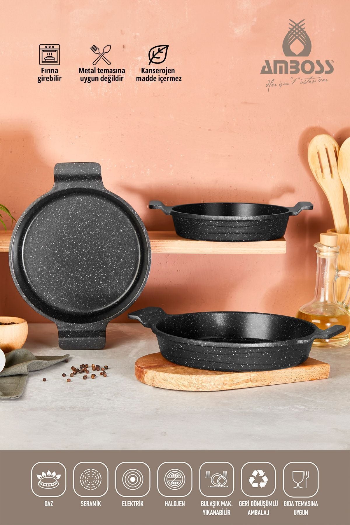 Amboss Astral 3 Parça Granit Döküm Sahan Seti AST; 0946 Ürün Bilgisi 18 cm 20 cm 22 cm Ürün Hakkında • Çizilmeye ve aleve karşı dayanıklı • 2 yıl garantili • 3 kat yanmaz yapışmaz malzeme • Bulaşık Makinesinde yıkanabilir • Gıda temasına uygun • Granit kaplama ? Astral 3'lü Sahan Seti, üst düzey pişirme imkanı sunuyor; Kansorajen madde içermeyen yapısı, dayanıklı malzemeler kullanılarak tasarlanmıştır; Buhar delikli cam kapakları sayesinde besinlerin lezzetini yitirmeden pişmesini sağlayan sahan 18, 20 ve 22 cm boyutlarında üretilmiştir; ? Hem fırın hem de ocakta kullanabileceğiniz sahan seti, yüksek ısıya dayanıklıdır; Bu sayede en lezzetli besinleri pişirebilir, sevdiklerinizle keyifle yiyeceğiniz sabah kahvaltılarına akşam ve öğlen yemeklerinde sizlere daha lezzetli yemekler için eşlik edecek;