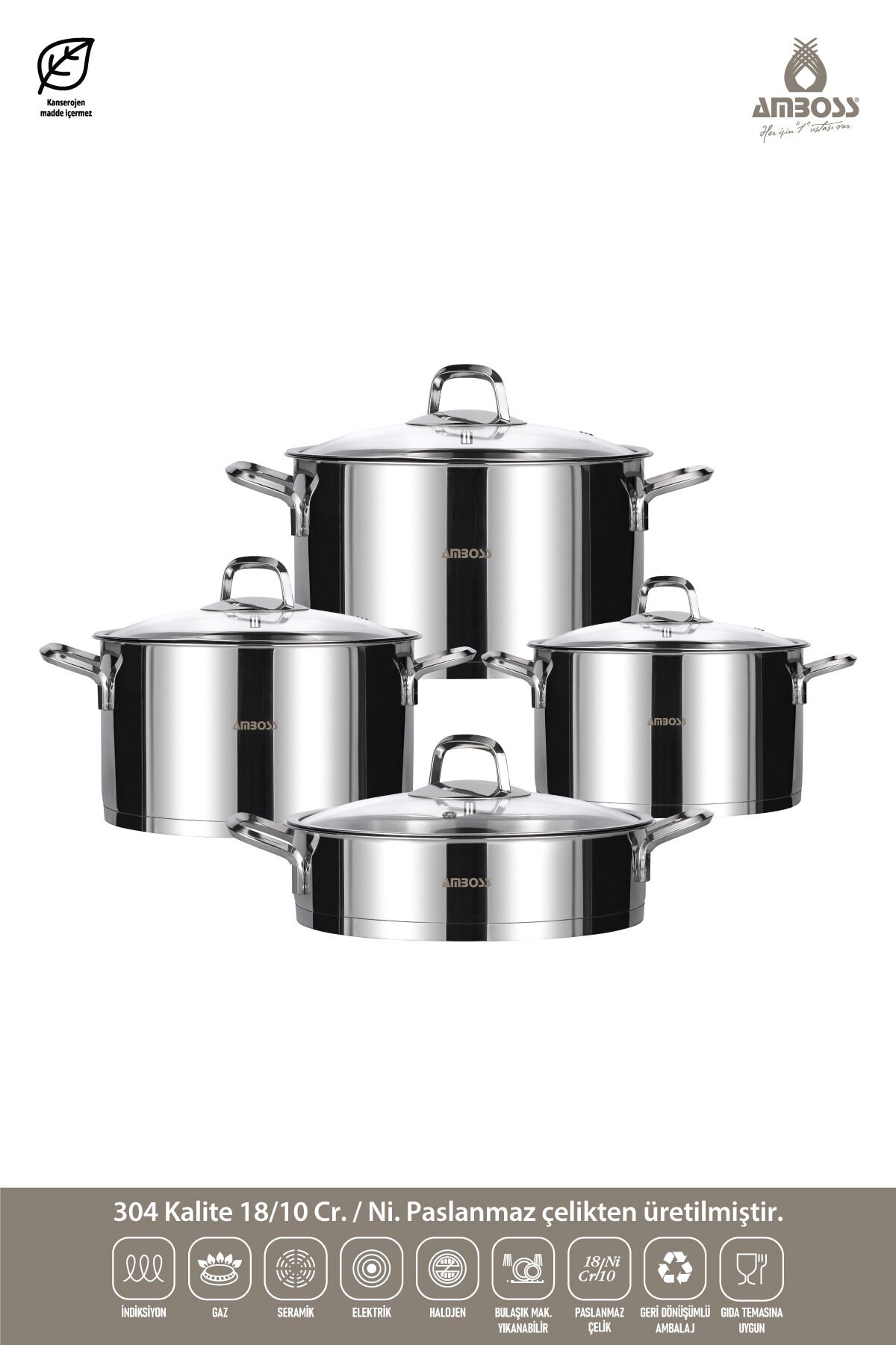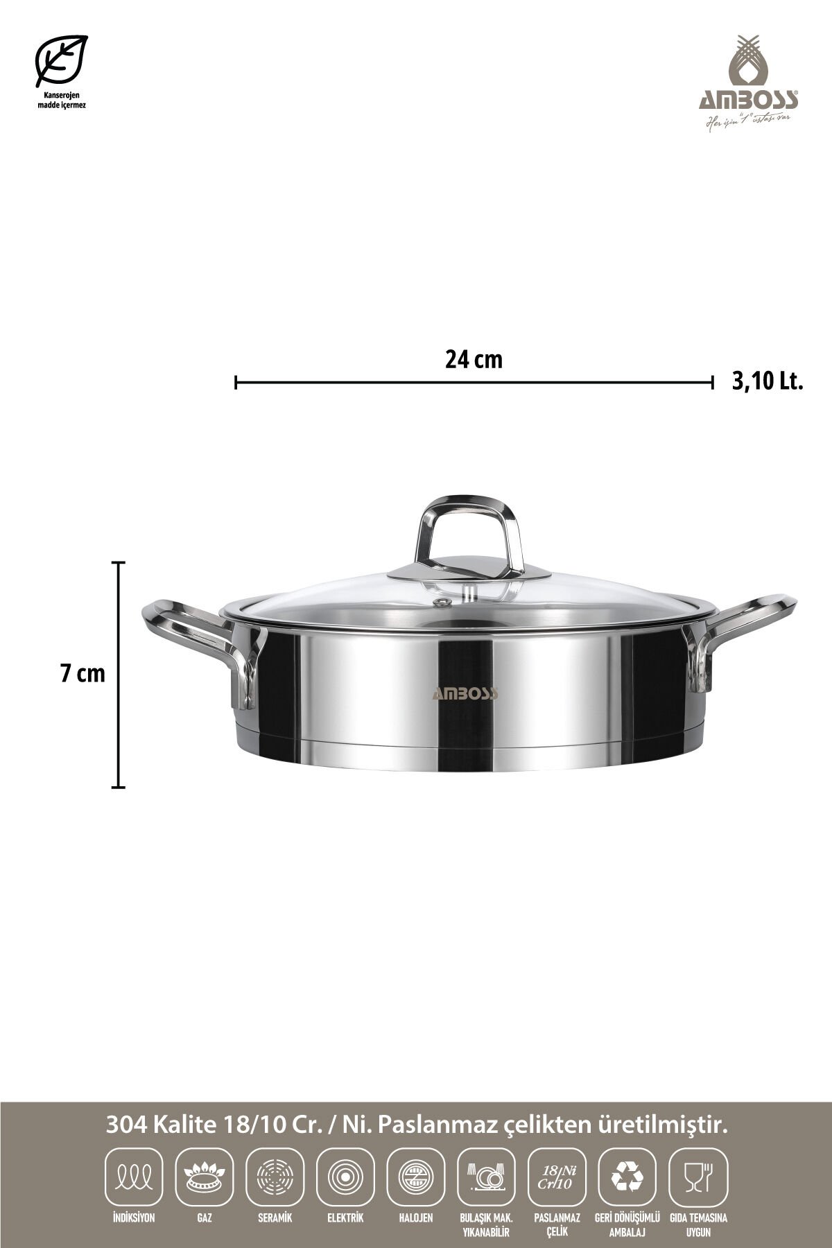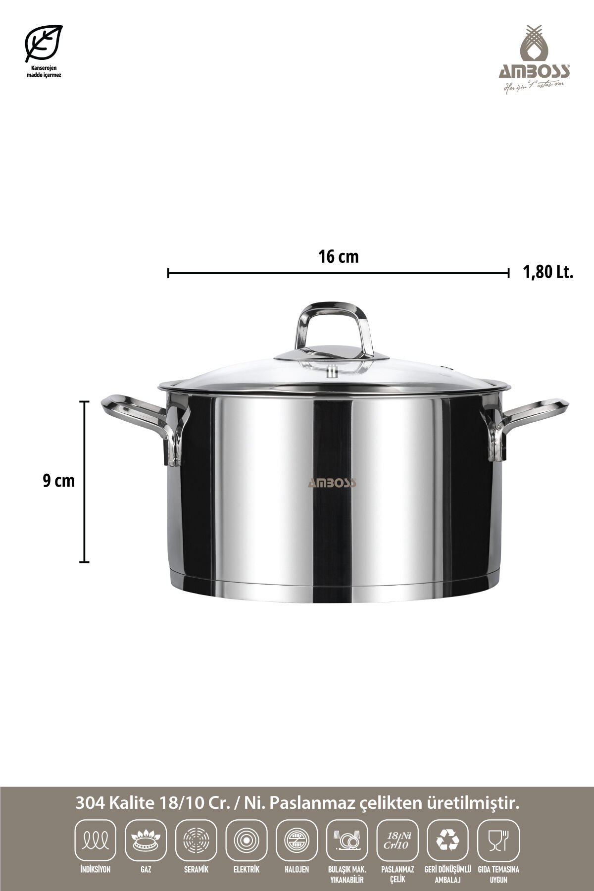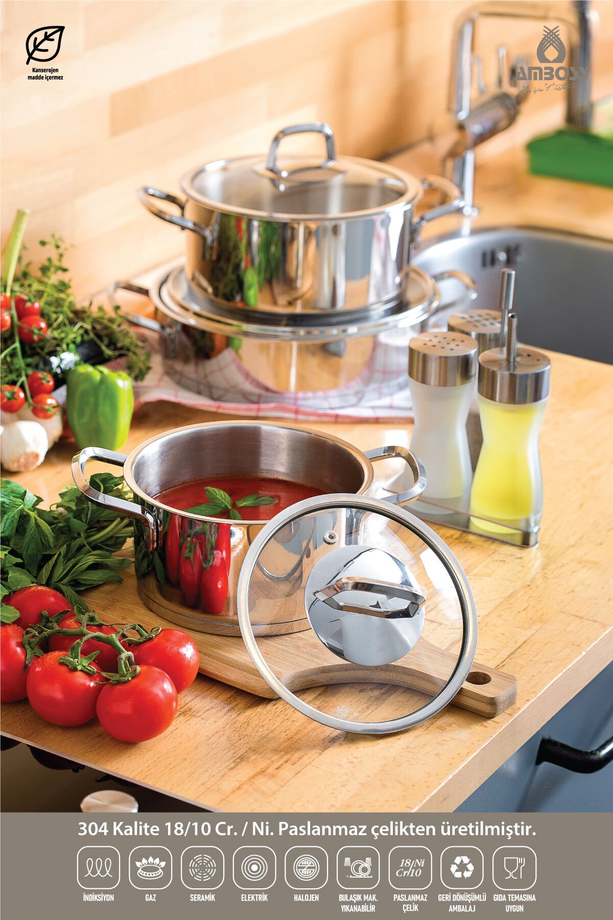 1,80 Lt. 3,10 Lt. 3,40 Lt. 6,30 Lt. Malzeme: Paslanmaz Çelik ; 18/10 paslanmaz çelikten üretilmiştir, ; Bakalit kulplar ısınmaz ve rahat tutuş sağlar, ; Gazlı, halojen, elektrikli ve indüksiyon ocak tiplerine uygundur. ; Cam kapağı, pişirme sürecinin kolayca takip edilebilmesini sağlar, ; Sağlıklı pişirme sağlar. ; Kullanım, Temizlik ve Bakım: ; Bulaşık makinesinde krem veya sıvı deterjanla yıkanabilir. ; Sert temizlik maddeleri veya tel ile ovularak temizlenmemelidir. ; Ürünü kullanmaya başlamadan önce seasoning işlemi uygulamak; ayrıca tahta veya plastik kaşık vb. gereçlerle kullanmak ürünün ömrünü uzatmanıza yardımcı olur. ; Uzun süre yüksek ateşe maruz bırakılmaması, hem sağlıklı pişirme hem de ürünün kullanım ömrü açısından çok önemlidir. ; Çelik tencere ve tavalarda yemek pişirirken ocağın ısı seviyesini orta ve kısık ateşte tutmamaya dikkat etmeniz tavsiye edilir. ; Ürünlerimiz Amboss Kurumsal yapısına uygun olarak Resmi Kalite standartları ile onaylı 304 Kalite Paslanmaz Çelikten Üretilmektedir ve garanti altına alınmaktadır. ;