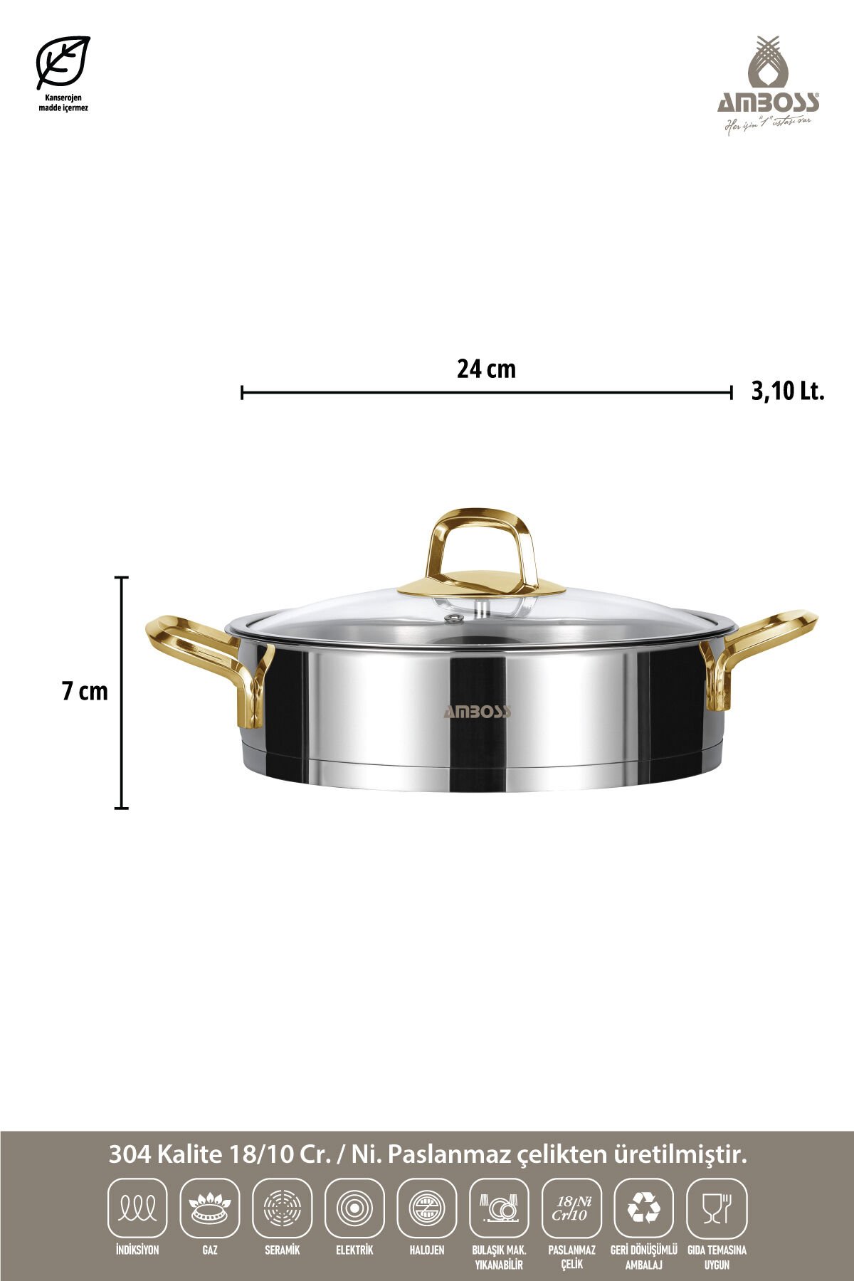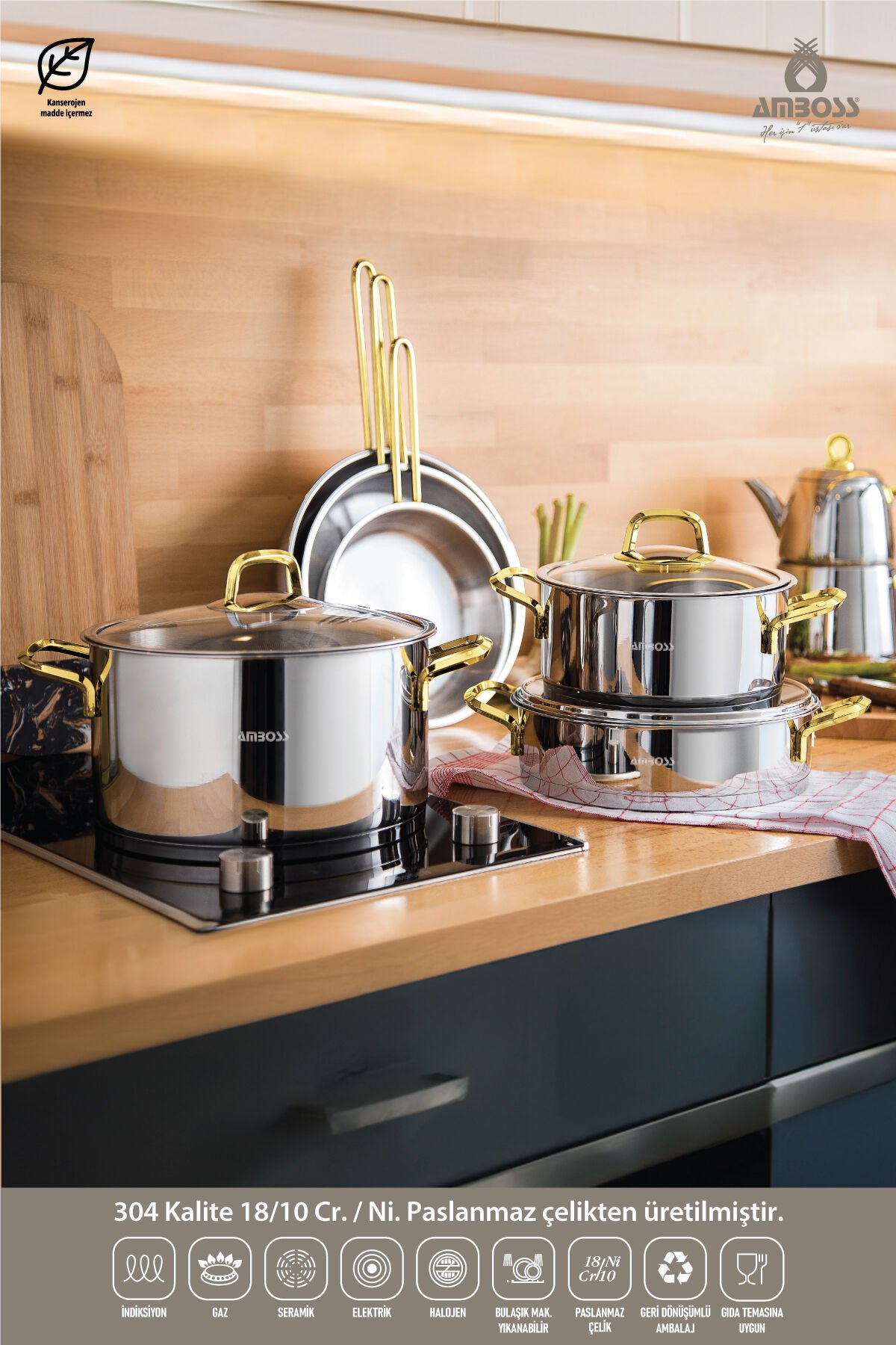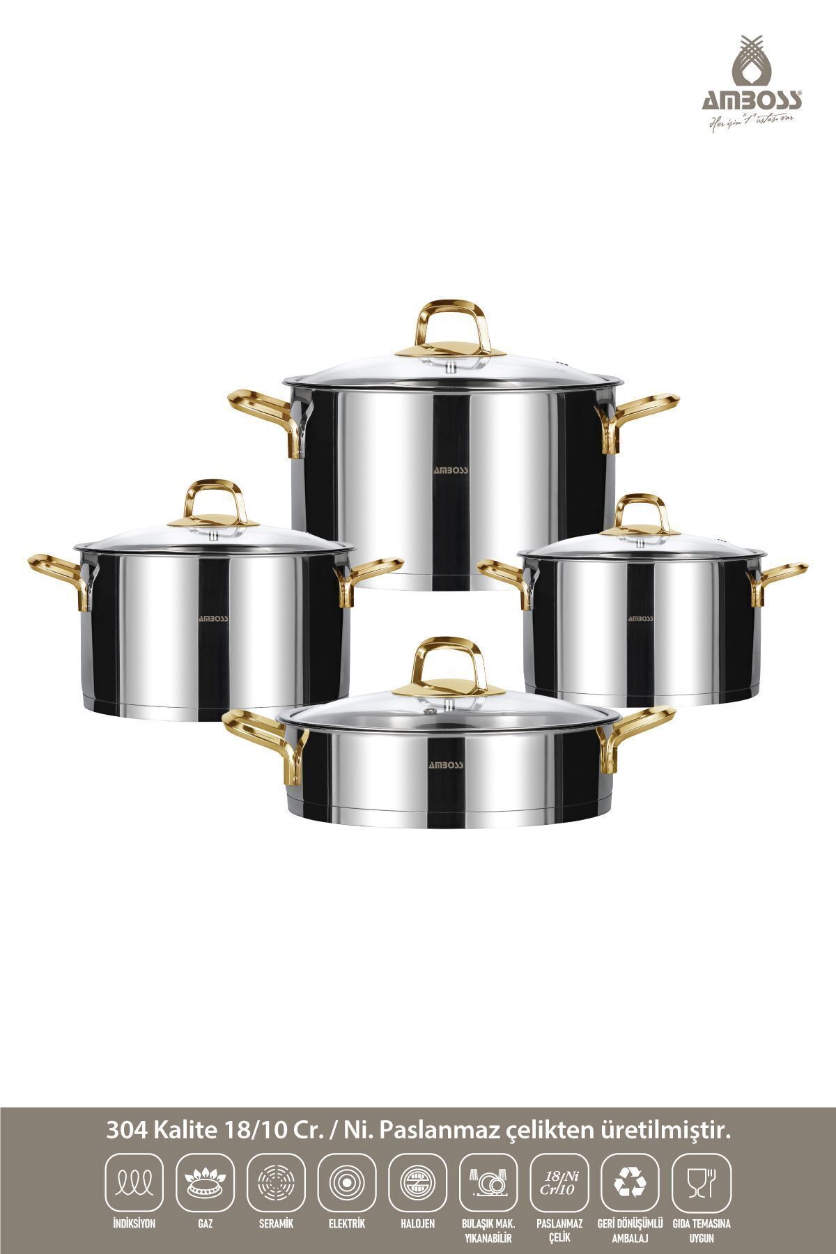 Diamond 8 Parça Paslanmaz Çelik Tencere Seti: Mutfakların Şık ve İşlevsel Seçeneği Mutfaklarınızı Altınla Taçlandırın! Diamond 8 Parça Paslanmaz Çelik Tencere Seti, sadece bir tencere takımı değil, aynı zamanda mutfaklarınıza şıklık ve zarafet katacak bir sanat eseri. Altın rengi kulpları ve elmas kesim detaylarıyla öne çıkan bu set, hem görsel bir şölen sunuyor hem de üstün performansıyla yemek hazırlama deneyiminizi kolaylaştırıyor. Neden Diamond 8 Parça Seti Tercih Edilmeli? Şık ve Modern Tasarım: Altın rengi kulplar ve elmas kesim detaylarıyla mutfağınızın odak noktası olacak. ; Yüksek Kaliteli Malzeme: Paslanmaz çelikten üretildiği için uzun ömürlü, dayanıklı ve hijyeniktir. ; Çok Yönlü Kullanım: Farklı boyutlardaki tencereler sayesinde her türlü yemeği kolaylıkla hazırlayabilirsiniz. ; İndüksiyon Uyumluluğu: Tüm ocak tiplerinde kullanılabilir, özellikle indüksiyon ocaklarla mükemmel uyum sağlar. ; Kapsül Taban Teknolojisi: Hızlı ve eşit ısı dağılımı sayesinde yemekleriniz daha lezzetli olur. ; Cam Kapaklar: Pişirme sürecinizi kontrol etmenizi sağlar ve ısı kaybını önler. ; Buhar Sepeti: Sağlıklı beslenme için buharda pişirme imkanı sunar. ; Setin İçeriği ve Detayları 16 cm Derin Tencere 1,8 lt Küçük porsiyonlar veya soslar için idealdir. ; 20 cm Derin Tencere 3,40 lt Günlük yemekleriniz için ideal boyuttadır. ; 24 cm Derin Tencere 5,5 lt Büyük aile yemekleri veya tencere yemekleri için uygundur. ; 24 cm Basık Tencere 3,10 lt Et soteleme, sebze kavurma gibi işlemler için idealdir. ; 3 Farklı Boyutta Cam Kapak: Her tencereye uygun, ısıya dayanıklı cam kapaklar. ; Buhar Sepeti: Sağlıklı beslenme için buharda pişirme imkanı sunar. ; Diamond 8 Parça Setinin Avantajları Mutfakta Şıklık: Altın rengi kulplar ve elmas kesim detaylarıyla mutfağınıza lüks bir hava katar. ; Dayanıklılık: Paslanmaz çelik sayesinde uzun yıllar boyunca kullanabilirsiniz. ; Pratiklik: İndüksiyon tabanlı olması sayesinde tüm ocak tiplerinde kullanılabilir. ; Hijyenik: Paslanmaz çelik yapısı sayesinde kolay temizlenir ve bakteri barındırmaz. ; Enerji Tasarrufu: Kapsül taban teknolojisi sayesinde daha az enerji harcar.