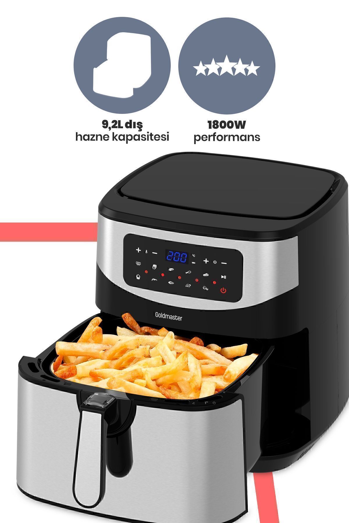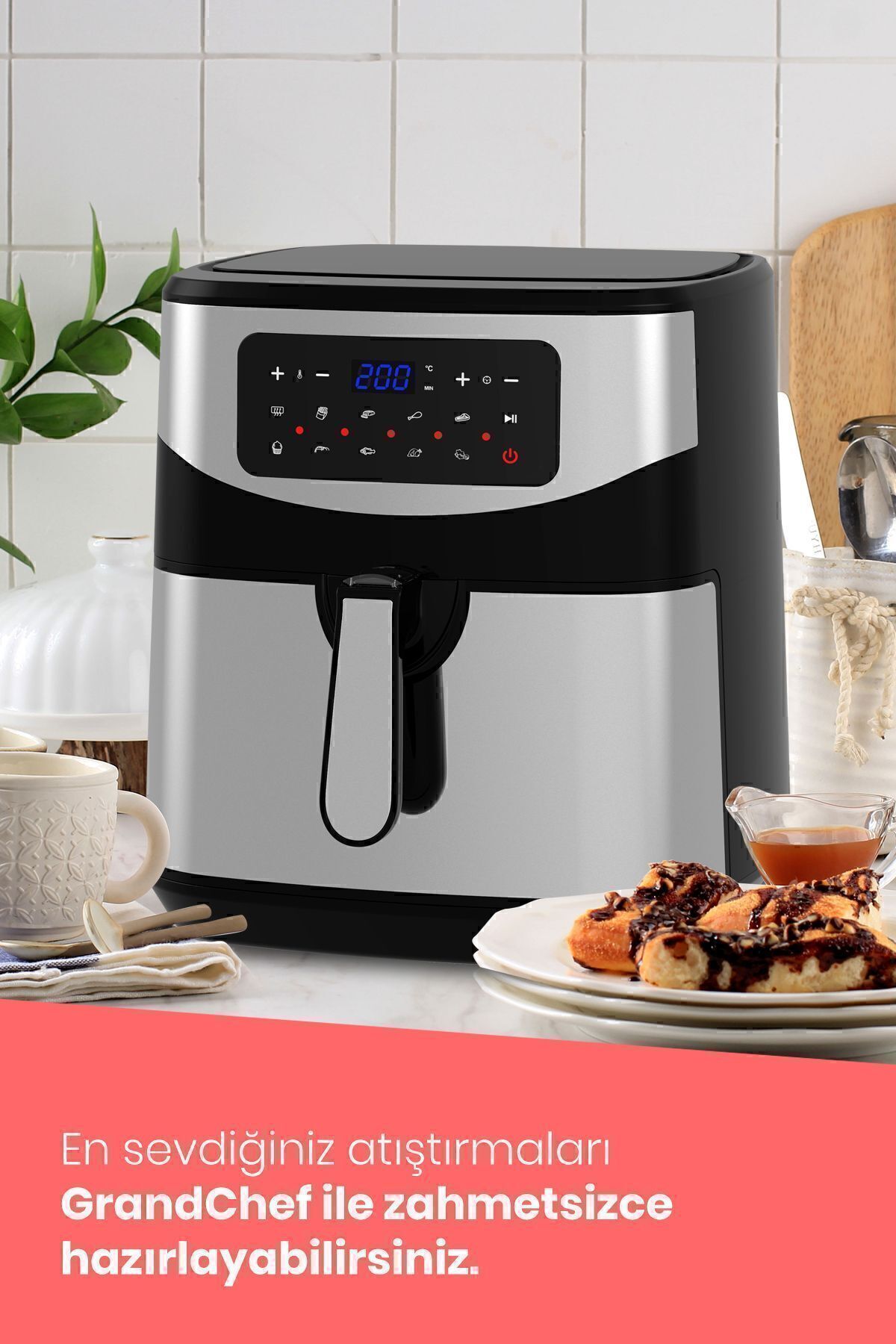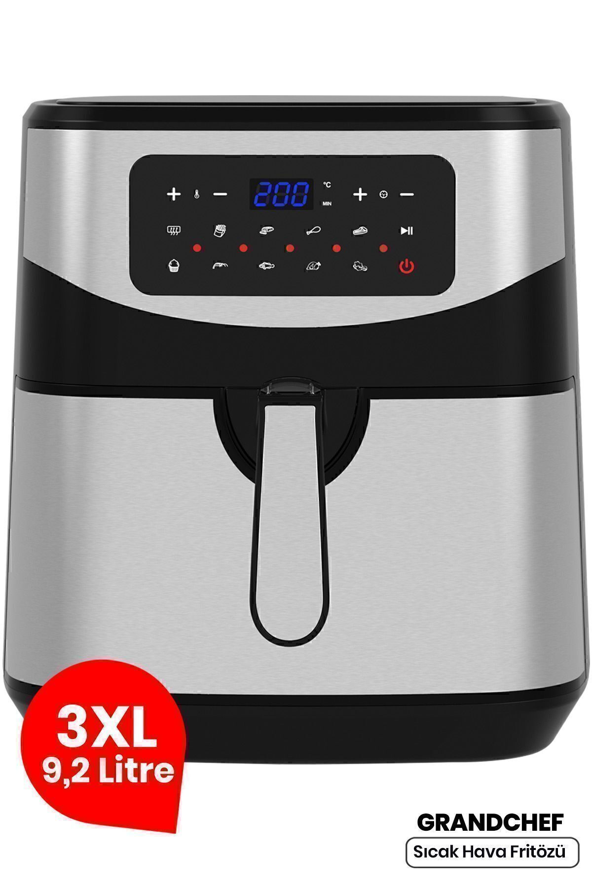 Grandchef 9.2 Litre Inox Geniş Hazneli 3xl Dokunmatik 10 Ön Ayarlı Airfryer Sıcak Hava Fritözü Ürün Özellikleri 1800 Watt performans 9,2L dış hazne kapasitesi 7L pişirme kapasitesi Ayarlanabilir sıcaklık, 50 - 200 ? 60 dakikaya kadar zamanlayıcı Isınmayan tutma sapı Dokunmatik dijital ekran Aşırı ısınmaya karşı koruma Dinamik hava akışı teknolojisi Akıllı 10 ön ayar menüsü Yapışmaz çıkarılabilir yıkanabilir pişirme sepeti Hazne çıkarıldığında otomatik kapanma emniyeti Kaymaz taban Ön ısıtma fonksiyonu