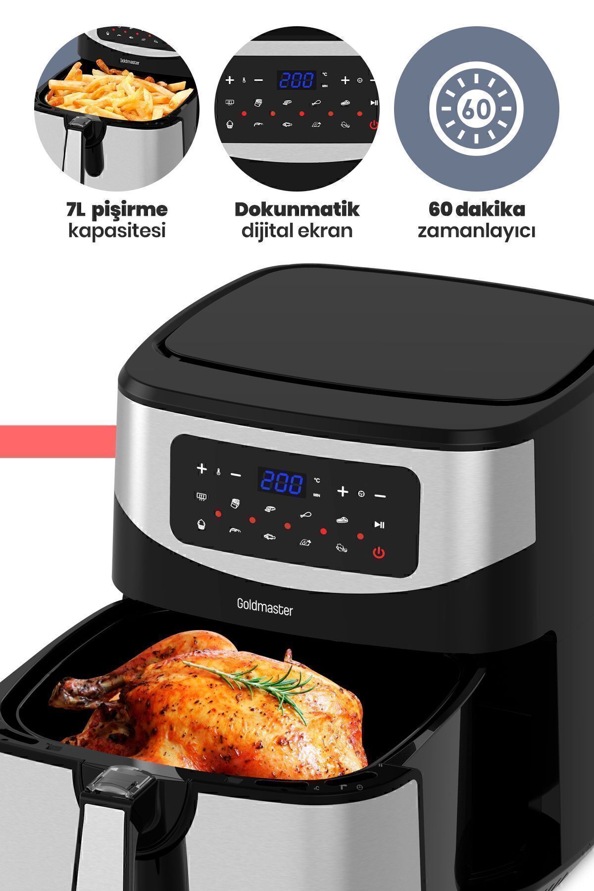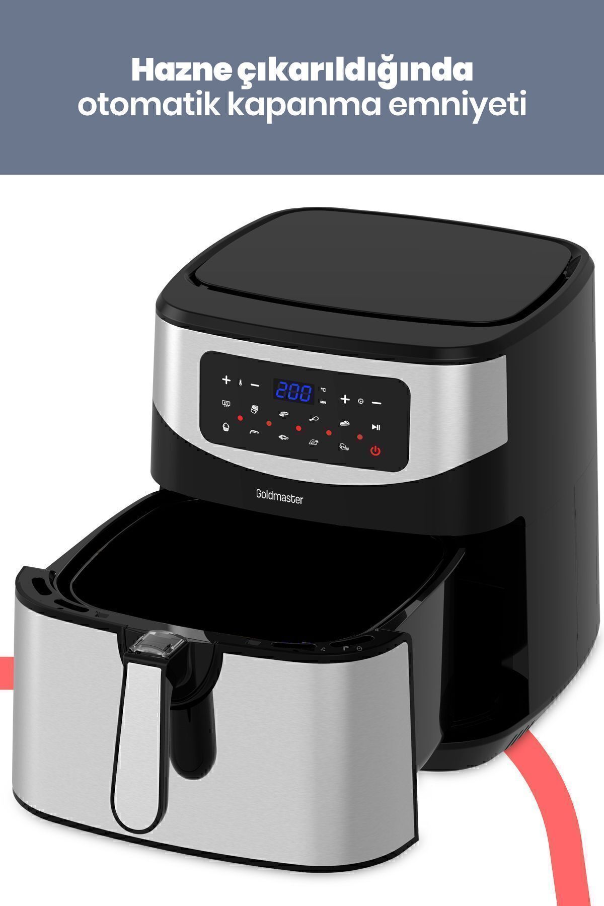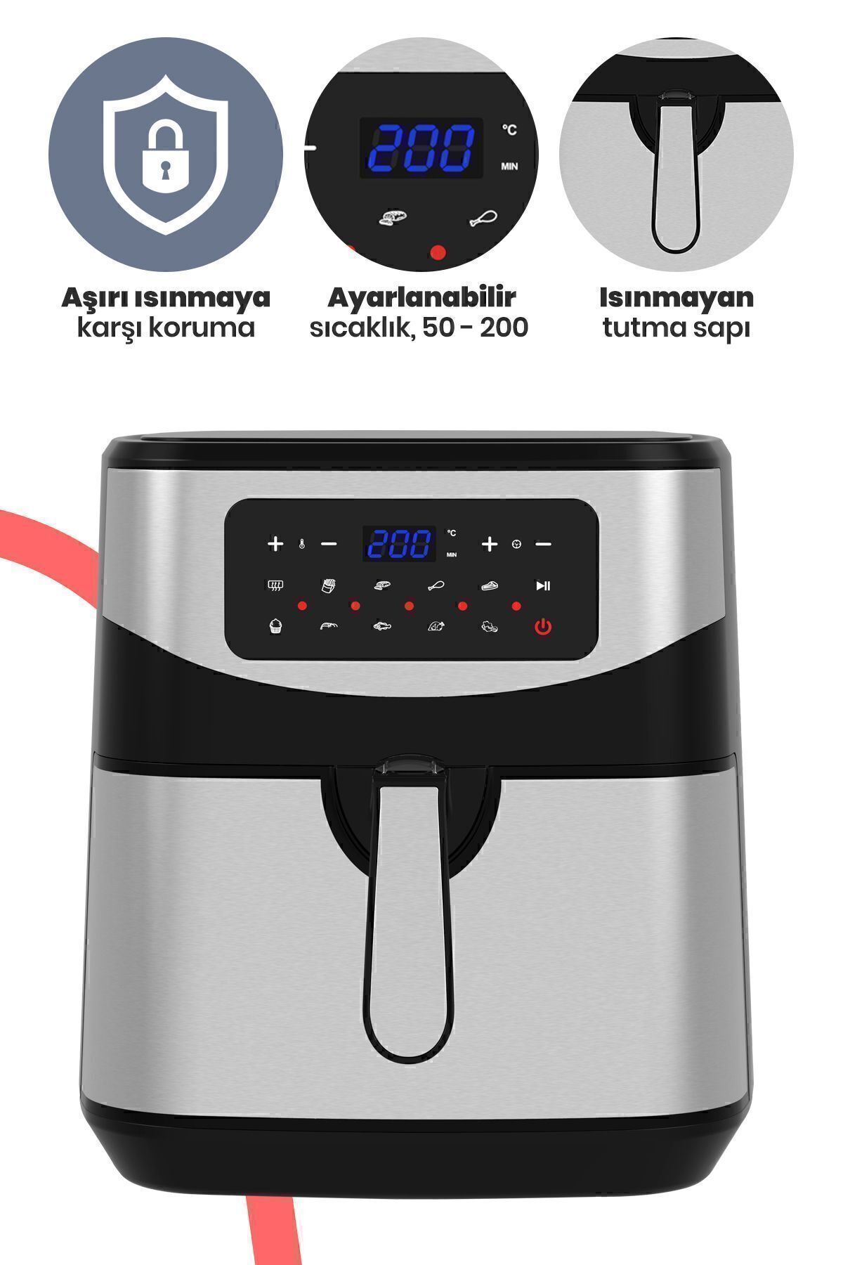 Grandchef 9.2 Litre Inox Geniş Hazneli 3xl Dokunmatik 10 Ön Ayarlı Airfryer Sıcak Hava Fritözü Ürün Özellikleri 1800 Watt performans 9,2L dış hazne kapasitesi 7L pişirme kapasitesi Ayarlanabilir sıcaklık, 50 - 200 ? 60 dakikaya kadar zamanlayıcı Isınmayan tutma sapı Dokunmatik dijital ekran Aşırı ısınmaya karşı koruma Dinamik hava akışı teknolojisi Akıllı 10 ön ayar menüsü Yapışmaz çıkarılabilir yıkanabilir pişirme sepeti Hazne çıkarıldığında otomatik kapanma emniyeti Kaymaz taban Ön ısıtma fonksiyonu