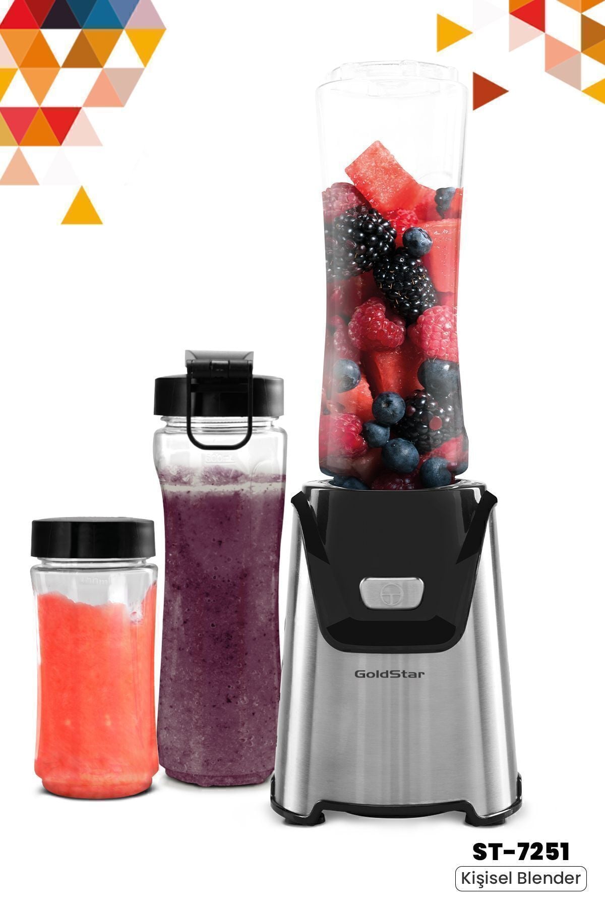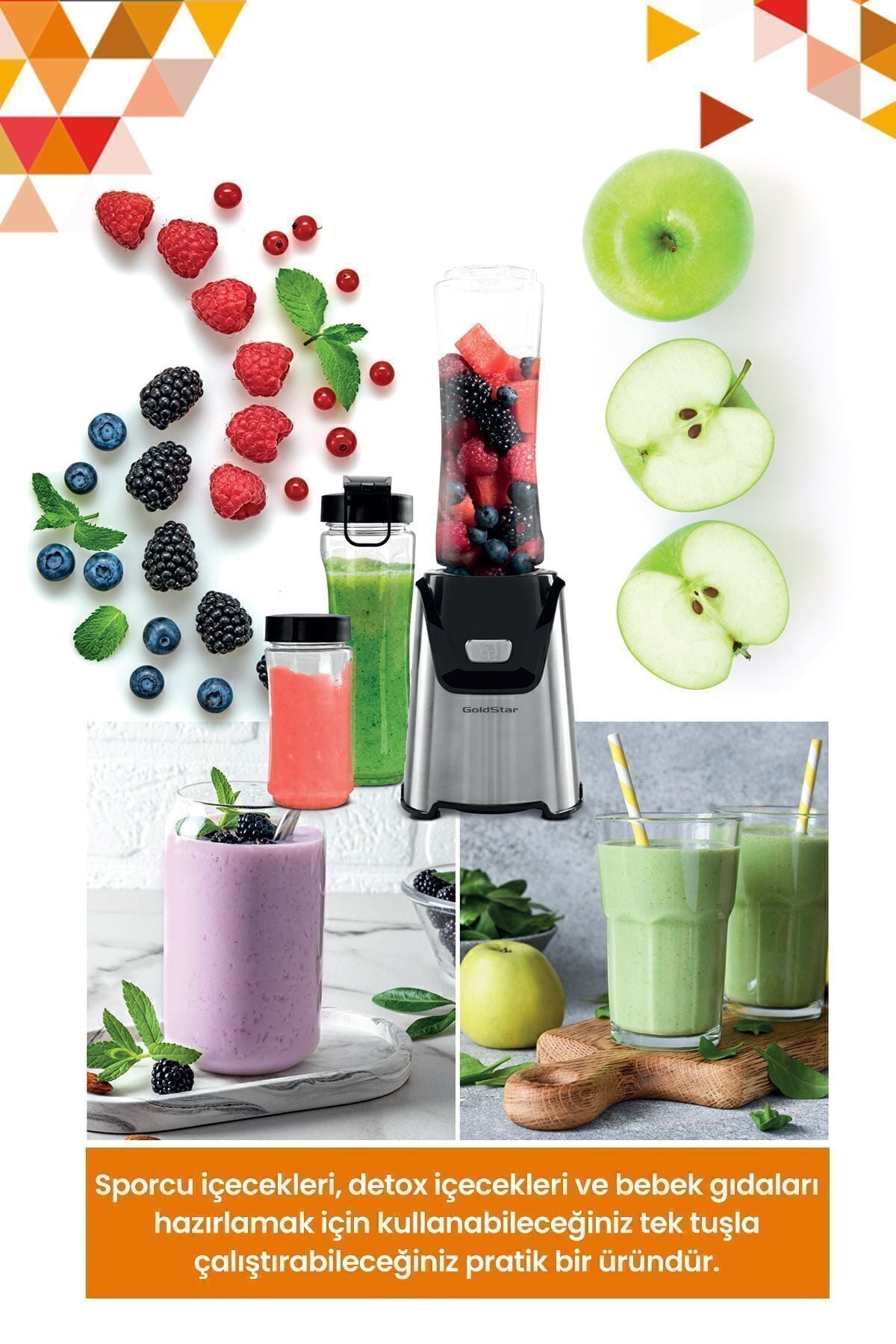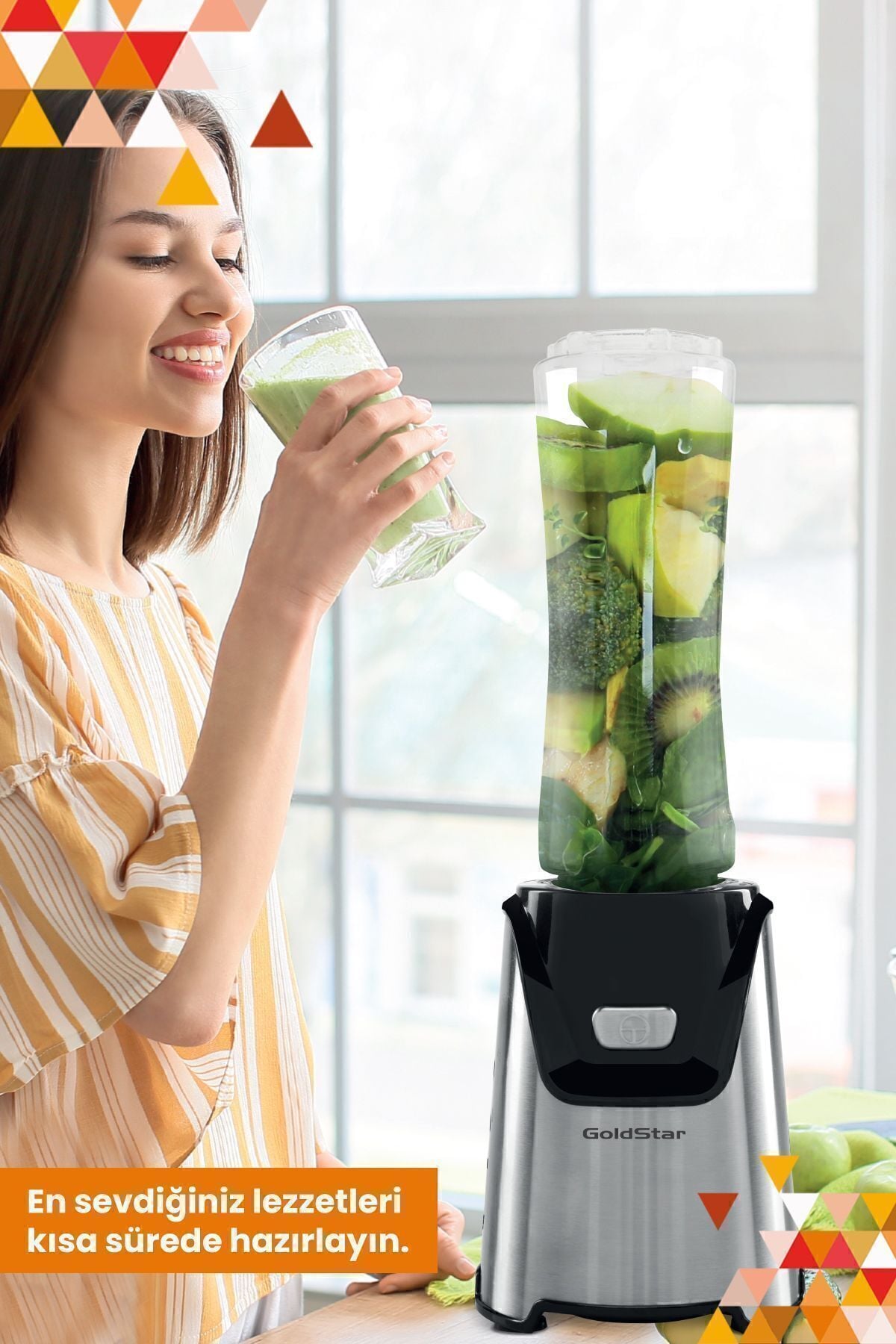 Modern tasarımı ile mutfak dekorasyonunuza şıklık katan Inox kişisel smoothie blender, günlük kullanım için idealdir; Buz kırma özelliği bulunmayan bu ürün, smoothie ve diğer içeceklerinizi hızlı ve kolay bir şekilde hazırlamanızı sağlar; 2 yıl Goldmaster garantisi ile güvenilir kullanım sunar; herhangi bir sorun karşısında destek alabilirsiniz; Tek kademeli hız ayarı sayesinde, malzemelerinizi istediğiniz kıvama kolayca getirebilirsiniz; Plastik hazne malzemesi, hafifliği ve dayanıklılığı ile pratik bir kullanım deneyimi sunar;