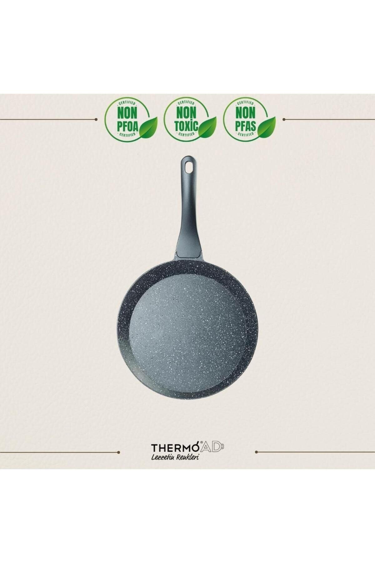 Şık gri renk tasarımıyla mutfak dekorasyonunuza modern bir dokunuş ekler.; Tek parça halinde kolay kullanım sunar, pratik ve kompakt bir pişirme deneyimi sağlar.; İç yüzeyi granit malzeme ile üretilmiştir, bu sayede yüksek kaliteli ve dayanıklı bir yapıya sahiptir.; Dış yüzeyinde de granit malzeme kullanılarak uzun süreli kullanım için idealdir; dış kaplamadaki bu özellik sayesinde ısıyı eşit dağıtır ve daha sağlıklı pişirme imkanı sunar.; Yapışmaz tabanı sayesinde kreplerinizi kolayca çevirerek mükemmel şekilde kızartabilir, lezzetli ve pürüzsüz sonuçlar elde edebilirsiniz.; Krep yapımında özel olarak tasarlanmış olup, geniş yüzey alanı ile birden fazla krep pişirmenize olanak tanır.;