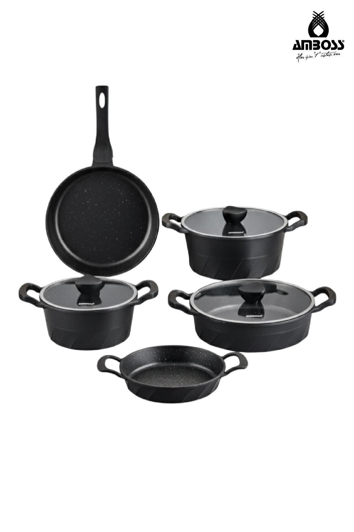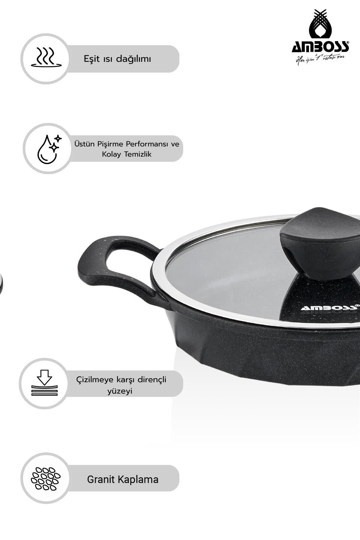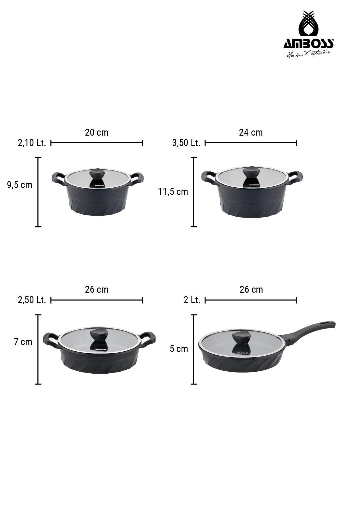 Amboss Kuvars 8 Parça Döküm Tencere Tava Sahan Seti Mutfakta profesyonel bir dokunuş ve uzun ömürlü kullanım arayanlar için tasarlanan Amboss Kuvars 8 Parça Döküm Tencere, Tava ve Sahan Seti, şıklığı yüksek performansla birleştiriyor.; İşte mutfağınızın yeni favorisi olacak bu setin öne çıkan özellikleri ve detayları: Mutfağın Yıldızı: Amboss Kuvars 8 Parça Set Bu özel set, her türlü yemek tarifi için ideal boyutlarda parçalar sunarken, döküm yapısı sayesinde yemeklerinize "taş fırın" lezzeti katar.; Yanmaz ve yapışmaz yüzeyi ile daha az yağ kullanarak sağlıklı öğünler hazırlamanıza olanak tanır.; Set İçeriği ve Ölçüleri Geniş aile sofralarından hızlı kahvaltılara kadar her ana eşlik eden parçalar: • 20x9,5 cm Derin Tencere (2.10 Lt): Pilavlar ve garnitürler için ideal.; • 24x11,5 cm Derin Tencere (3.50 Lt): Sulu yemekler ve çorbalar için geniş kapasite.; • 26x7 cm Basık Tencere (2.50 Lt): Karnıyarık ve sote yemeklerinin vazgeçilmezi.; • 26x5 cm Tava (2 Lt): Mükemmel mühürleme ve kızartma performansı.; • 20 cm Sahan: Kahvaltıların ve tek porsiyonluk lezzetlerin ustası.; Neden Amboss Kuvars Tercih Etmelisiniz? 1. Eşit Isı Dağılımı ve Tasarruf Döküm gövde yapısı ısıyı her noktaya eşit yayar.; Bu sayede yemeklerinizin her yeri aynı derecede pişerken, ısıyı uzun süre muhafaza ederek enerji tasarrufu sağlar.; 2. Üstün Çizilme Direnci Kuvarsın doğal dayanıklılığı ile güçlendirilmiş yüzeyi, çizilmelere karşı ekstra dirençlidir.; Uzun yıllar ilk günkü formunu korur.; 3. Kolay Temizlik ve Hijyen Gelişmiş yapışmaz teknolojisi sayesinde yemek artıkları yüzeye tutunamaz.; Elde veya makinede zahmetsizce temizlenebilir.; 4. Ergonomik ve Şık Tasarım Modern hatları ve estetik görünümüyle mutfak dekorasyonunuza değer katar.; Isıya dayanıklı kulplar güvenli bir tutuş sağlar.