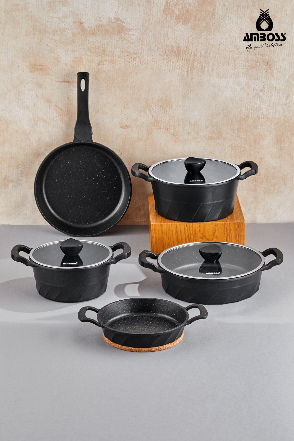 Amboss Kuvars 8 Parça Döküm Tencere Tava Sahan Seti Mutfakta profesyonel bir dokunuş ve uzun ömürlü kullanım arayanlar için tasarlanan Amboss Kuvars 8 Parça Döküm Tencere, Tava ve Sahan Seti, şıklığı yüksek performansla birleştiriyor.; İşte mutfağınızın yeni favorisi olacak bu setin öne çıkan özellikleri ve detayları: Mutfağın Yıldızı: Amboss Kuvars 8 Parça Set Bu özel set, her türlü yemek tarifi için ideal boyutlarda parçalar sunarken, döküm yapısı sayesinde yemeklerinize "taş fırın" lezzeti katar.; Yanmaz ve yapışmaz yüzeyi ile daha az yağ kullanarak sağlıklı öğünler hazırlamanıza olanak tanır.; Set İçeriği ve Ölçüleri Geniş aile sofralarından hızlı kahvaltılara kadar her ana eşlik eden parçalar: • 20x9,5 cm Derin Tencere (2.10 Lt): Pilavlar ve garnitürler için ideal.; • 24x11,5 cm Derin Tencere (3.50 Lt): Sulu yemekler ve çorbalar için geniş kapasite.; • 26x7 cm Basık Tencere (2.50 Lt): Karnıyarık ve sote yemeklerinin vazgeçilmezi.; • 26x5 cm Tava (2 Lt): Mükemmel mühürleme ve kızartma performansı.; • 20 cm Sahan: Kahvaltıların ve tek porsiyonluk lezzetlerin ustası.; Neden Amboss Kuvars Tercih Etmelisiniz? 1. Eşit Isı Dağılımı ve Tasarruf Döküm gövde yapısı ısıyı her noktaya eşit yayar.; Bu sayede yemeklerinizin her yeri aynı derecede pişerken, ısıyı uzun süre muhafaza ederek enerji tasarrufu sağlar.; 2. Üstün Çizilme Direnci Kuvarsın doğal dayanıklılığı ile güçlendirilmiş yüzeyi, çizilmelere karşı ekstra dirençlidir.; Uzun yıllar ilk günkü formunu korur.; 3. Kolay Temizlik ve Hijyen Gelişmiş yapışmaz teknolojisi sayesinde yemek artıkları yüzeye tutunamaz.; Elde veya makinede zahmetsizce temizlenebilir.; 4. Ergonomik ve Şık Tasarım Modern hatları ve estetik görünümüyle mutfak dekorasyonunuza değer katar.; Isıya dayanıklı kulplar güvenli bir tutuş sağlar.