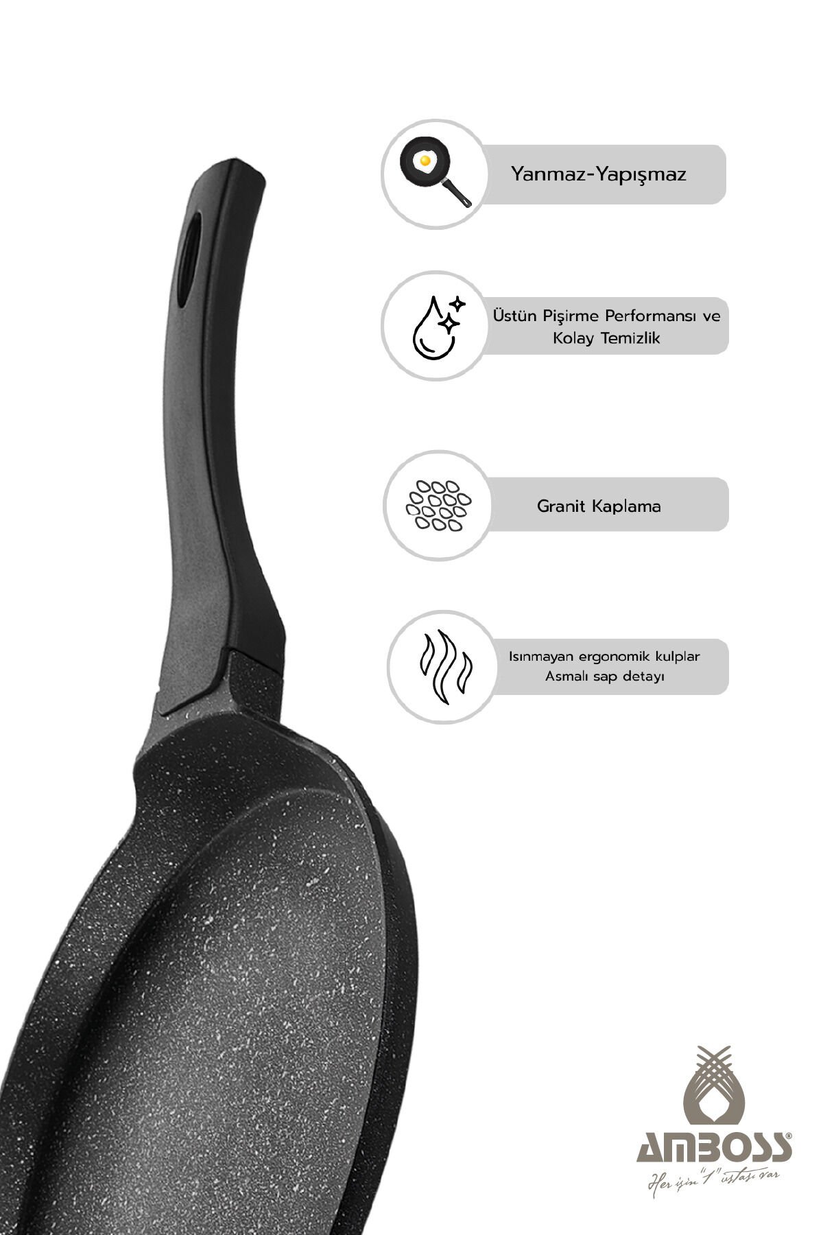 Amboss Mocca Granit Kaplama Krep Tavası 30 cm Mutfağınızın Yeni Yıldızı: Amboss Mocca 30 cm Granit Kaplama Krep Tavası Kahvaltı sofralarınızın vazgeçilmezi, pazar sabahlarının neşesi krep ve pancakeler artık profesyonel ellere emanet! Amboss Mocca 30 cm Granit Kaplama Krep Tavası, şıklığı ve üstün pişirme performansını bir araya getirerek mutfaktaki en büyük yardımcınız olmaya aday.; İşte bu harika tavayı vazgeçilmez kılan özellikler: Neden Amboss Mocca Krep Tavasını Seçmelisiniz? • Üstün Yapışmaz Granit Yüzey: Kreplerinizin tavaya yapışması tarih oluyor.; Özel granit kaplaması sayesinde çok az yağ kullanarak (hatta bazen hiç kullanmadan) kusursuz, incecik krepler hazırlayabilirsiniz.; • İdeal Boyut ve Ergonomi: 30 cm genişliğindeki ideal çapı, sadece krepler için değil; bazlama, akıtma ve pancake yapımı için de mükemmel alan sunar.; Ergonomik kulpları, elinizi yormadan kolayca kavramanızı ve kreplerinizi ustalıkla çevirmenizi sağlar.; • Geniş Ocak Uyumluluğu: Modern mutfakların tüm ihtiyaçlarına cevap veren Amboss Mocca; gazlı, halojen ve cam (seramik) ocaklarda güvenle kullanılabilir.; • Zahmetsiz Temizlik: Hem iç hem de dış yüzeyindeki özel kaplama sayesinde yemek artıkları yüzeye tutunamaz.; Pişirme sonrası temizlik saniyeler içinde biter, size de kahvaltınızın keyfini sürmek kalır.; Uzun Ömürlü Kullanım İçin Küçük Bir İpucu • Amboss Mocca'nın sağlam ve dayanıklı yapısını yıllar boyu korumak için, tavayı boş haldeyken uzun süre yüksek ateşte bırakmamanız önerilir.; Bu küçük detay, hem sağlıklı pişirme yapmanızı sağlar hem de granit kaplamanın ömrünü maksimuma çıkarır.; Teknik Özellikler Amboss Mocca 30 cm Krep Tavası, teknik donanımıyla mutfakta hem pratiklik hem de uzun ömürlü kullanım vaat ediyor.; Ürünün öne çıkan teknik detayları şöyledir: • Malzeme Yapısı: Darbelere karşı dayanıklı, yüksek kaliteli granit kaplama yüzeye sahiptir.; Sağlam gövdesi sayesinde ısıyı eşit dağıtarak her noktada aynı pişirme performansını sunar.; • Ölçü: 30 cm genişliğindeki ideal çapı, klasik krep ve büyük boy pancake yapımı için mükemmel bir alan sağlar.; • Ocak Uyumu: Esnek kullanım imkanı sunan bu tava; gazlı, halojen ve cam (seramik) ocak tiplerinin tamamında kullanıma uygundur.; • Tasarım ve Ergonomi: Şık görünümünü tamamlayan ergonomik kulplar, el yapısına tam uyum sağlayarak kolay tutuş ve güvenli manevra kabiliyeti kazandırır.; • Kaplama Teknolojisi: Kolay temizlenebilen özel iç ve dış kaplaması, yapışmazlık performansını artırırken hijyenik bir kullanım sunar.