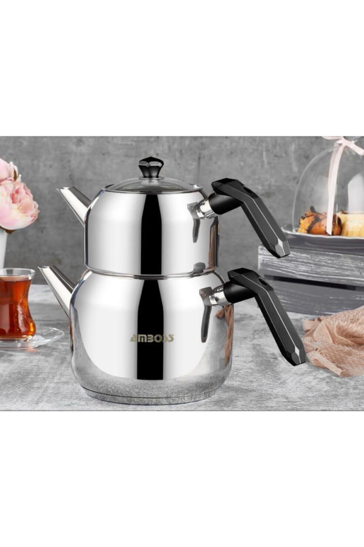 Büyük Boy : 1,3 lt Demlik Haznesi ve 2.8 lt Su Kazanı, Geniş Aileler İçin İdealdir.; Orta Boy : 1,0 lt Demlik Haznesi ve 2.0 lt Su Kazanı, Çekirdek Aileler İçin İdealdir.; Tüm çaydanlıklarımız 18/10 - 304 Cr Ni paslanmaz çeliktir.; Ömür boyu paslanmadan kullanabilirsiniz.; ; Kapsül tabanlıdır.; ; Taban mm kalınlığı ince ürünlerden değildir.; ; Farklı boy seçenekleri vardır.; ; 2 yıl garantilidir.; ; Orijinal ürünlerdir.; ; Modellerine göre çelik ve bakalit saplı modellerimizden dilediğinizi seçebilirsiniz.; ; İnce çelik ürünler değildir.; ; Bulaşık makinesinde yıkanabilir.; ; Tüm Amboss çaydanlıklar CE belgelidir.; ; PRATİK KULLANIM: Çelik tutma sapı ile rahatlıkla kullanabilirsiniz.; Bulaşık makinesinde yıkanabilir.; ; İDEAL BOYUT: Amboss çaydanlık, farklı boy seçenekleri ile dilediğiniz miktarda çayı en leziz şekilde demlemenize imkan sunuyor.; ; TÜM OCAK TİPLERİ İÇİN: Özel alaşımlı alüminyum kullanılarak oluşturulan kapsül tabanı tüm ocak tiplerine uygundur ayrıca ısıyı tencere içinde eşit şekilde dağıtarak suyunuzun daha çabuk kaynamasına, çayınızın daha hızlı demlenmesine katkıda bulunur.; ;