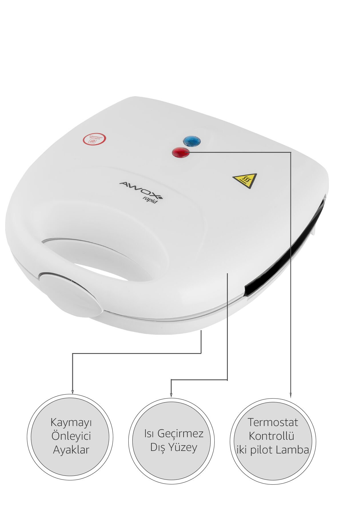 Minimal tasarlanan boyutu sayesinde neredeyse hiç yer kaplamaz ve farklı alanlarda kullanıma uygunluğu sayesinde istediğiniz yiyecekleri pratik bir şekilde pişirmenizi sağlar.; - Özel Isıtıcı Plaka Seramik kaplama ısıtıcı plaka yiyeceklerinizin yanmasının ve yapışmasının önüne geçerek en doğru ısı derecelerinde dengeli bir şekilde hazırlamanızı sağlar.; - Kolay temizlenen yapışmaz yüzeyler.; - Çalışma Gücü: 750 W.; - Çalışma Gerilim ve Frekansı: 230V, 50 Hz.; - Düşük enerji tüketimi sağlar.; - Isı ayarı otomatik.; Yüksek ısı koruması mevcut.; - Kapak kilidi mevcuttur.; - Renk: Beyaz.; - Isı geçirmez dış yüzeye sahiptir.; - 90° Açılabilen kapak ile dik durma özelliğine sabiptir.; - Termostat kontrollü iki pilot lamba mevcuttur.; - Ürün Ölçüsü (ExBxD)cm: 10 x 24 x 24 - Ürün Ağırlığı: 1,135 Gr.; - Kutu Ölçüsü (ExBxD)cm: 10.5 x 24.5 x 25 Kutu Ağırlığı: 1,320 Gr.