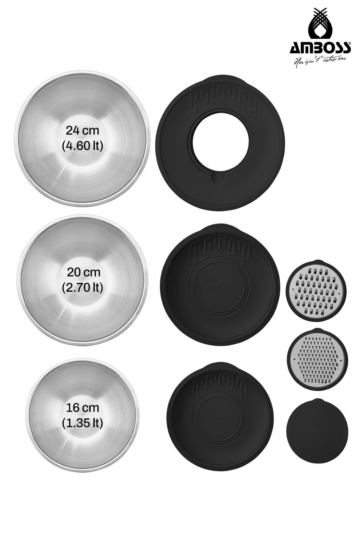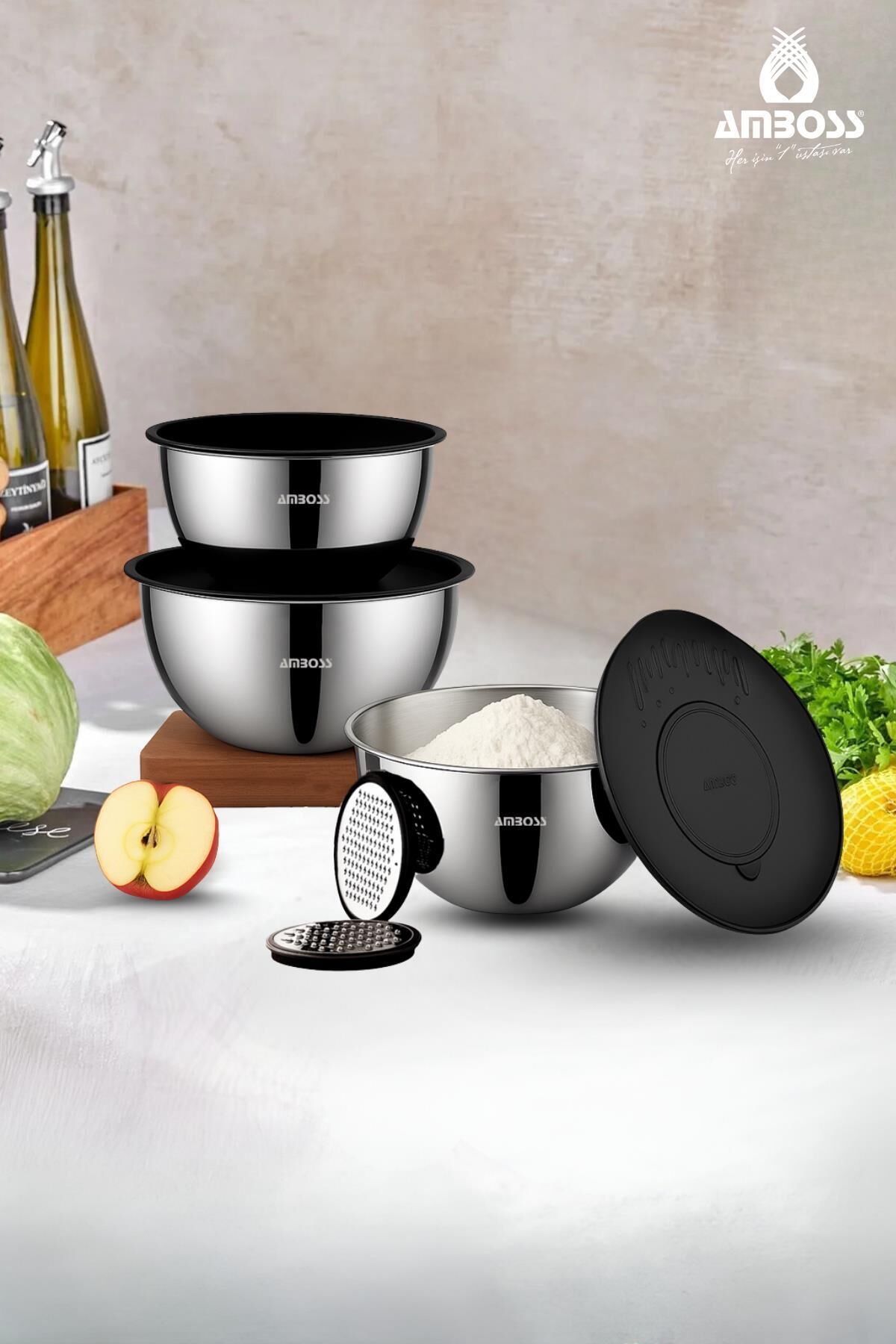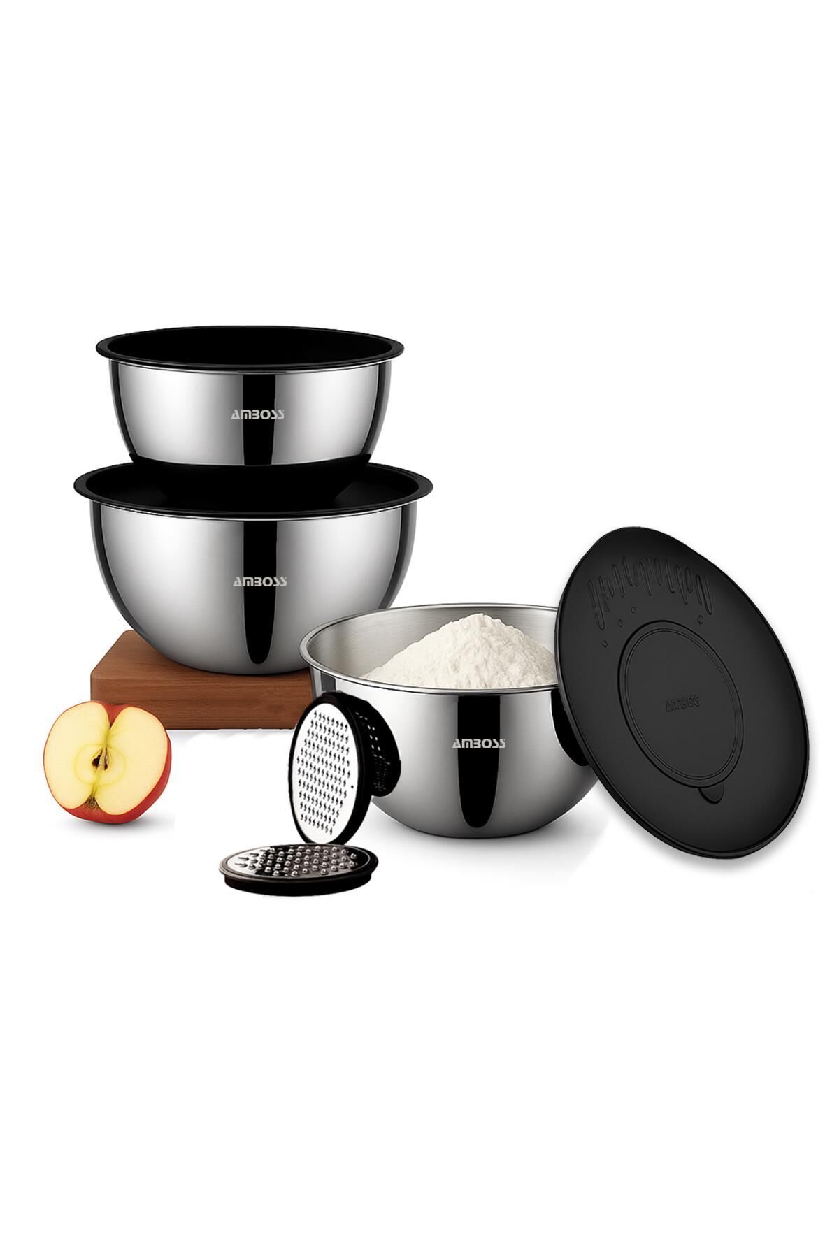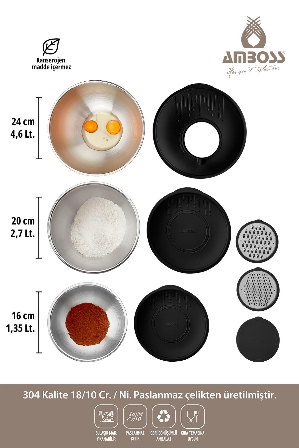 Amboss Satin 9 Parça Çok Amaçlı Kase Seti: Mutfaklarınızı Zenginleştirin! Mutfaklarınızda hem şıklığı hem de işlevselliği bir arada arıyorsanız, Amboss Satin 9 Parça Çok Amaçlı Kase Seti tam size göre! Bu set, yüksek kaliteli paslanmaz çelikten üretilmiş, farklı boyutlardaki kaseleri, pratik kapakları ve kullanışlı rendeleriyle mutfak hayatınızı kolaylaştıracak.; Hem günlük kullanım hem de özel günler için ideal olan bu set, mutfaklarınızın vazgeçilmezi olacak.; Amboss Satin Kase Setinin Özellikleri Paslanmaz Çelik Kalite: 18/10 304 yüksek kalite paslanmaz çelikten üretilmiştir.; Bu sayede uzun yıllar boyunca ilk günkü gibi parlaklığını korur ve paslanmaz.; ; Çok Amaçlı Kullanım: Karıştırma, çırpma, saklama ve servis gibi birçok farklı amaç için kullanılabilir.; ; Farklı Boyutlar: Set içerisinde 24 cm, 20 cm ve 16 cm olmak üzere farklı boyutlardaki kaseler bulunarak farklı ihtiyaçlarınıza cevap verir.; ; Kapaklı Tasarım: Kaselerin kapaklı olması sayesinde içerikleriniz tazeliğini korur ve buzdolabında kolayca saklanabilir.; ; Rendeler: Set içerisinde bulunan rendeler sayesinde sebze ve meyveleri kolayca rendeleyebilirsiniz.; ; Şık Tasarım: Modern ve şık tasarımıyla mutfaklarınızın dekorasyonunu tamamlar.; ; Kolay Temizlik: Bulaşık makinesinde yıkanabilir özelliği sayesinde temizliği oldukça pratiktir.; ; Neden Amboss Satin Kase Setini Tercih Etmelisiniz? Dayanıklılık: Paslanmaz çelik yapısı sayesinde darbelere karşı dayanıklıdır ve uzun ömürlü kullanım sunar.; ; Hijyenik: Paslanmaz çelik, bakteri üretmez ve temizliği kolay olduğu için hijyenik bir kullanım sağlar.; ; Çok Yönlü Kullanım: Hamur yoğurma, salata hazırlama, meyve doğrama gibi birçok farklı iş için kullanılabilir.; ; Yerden Tasarruf: Farklı boyutlardaki kaseler, farklı ihtiyaçlarınıza cevap verirken aynı zamanda mutfakta yer kaplamaz.; ; Şık Tasarım: Mutfaklarınızın görünümünü güzelleştirir.; ; Amboss Satin Kase Seti ile Mutfakta Yeni Bir Dönem Amboss Satin Kase Seti, mutfakta size zaman kazandıracak ve yemek yapma deneyiminizi daha keyifli hale getirecek.; Sağlam yapısı, şık tasarımı ve kullanışlı özellikleriyle mutfaklarınızın vazgeçilmez bir parçası olacak.