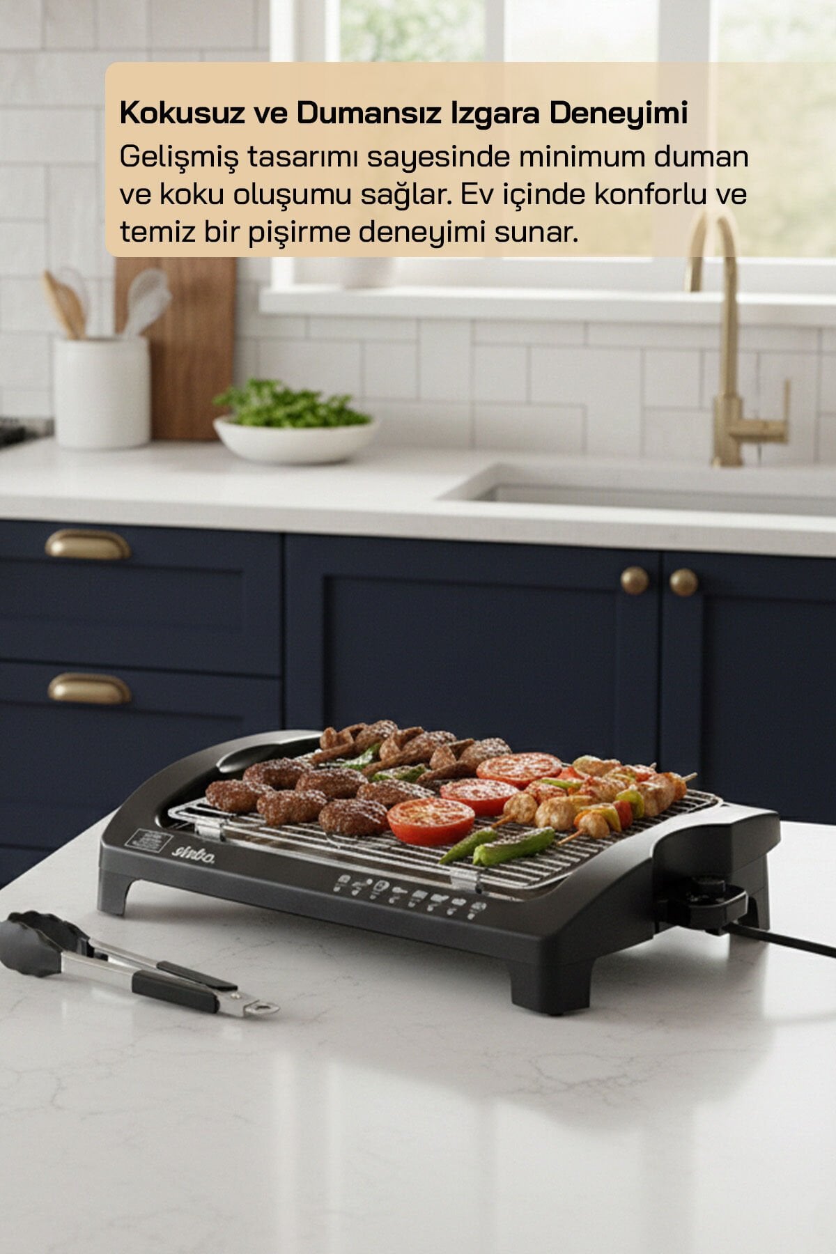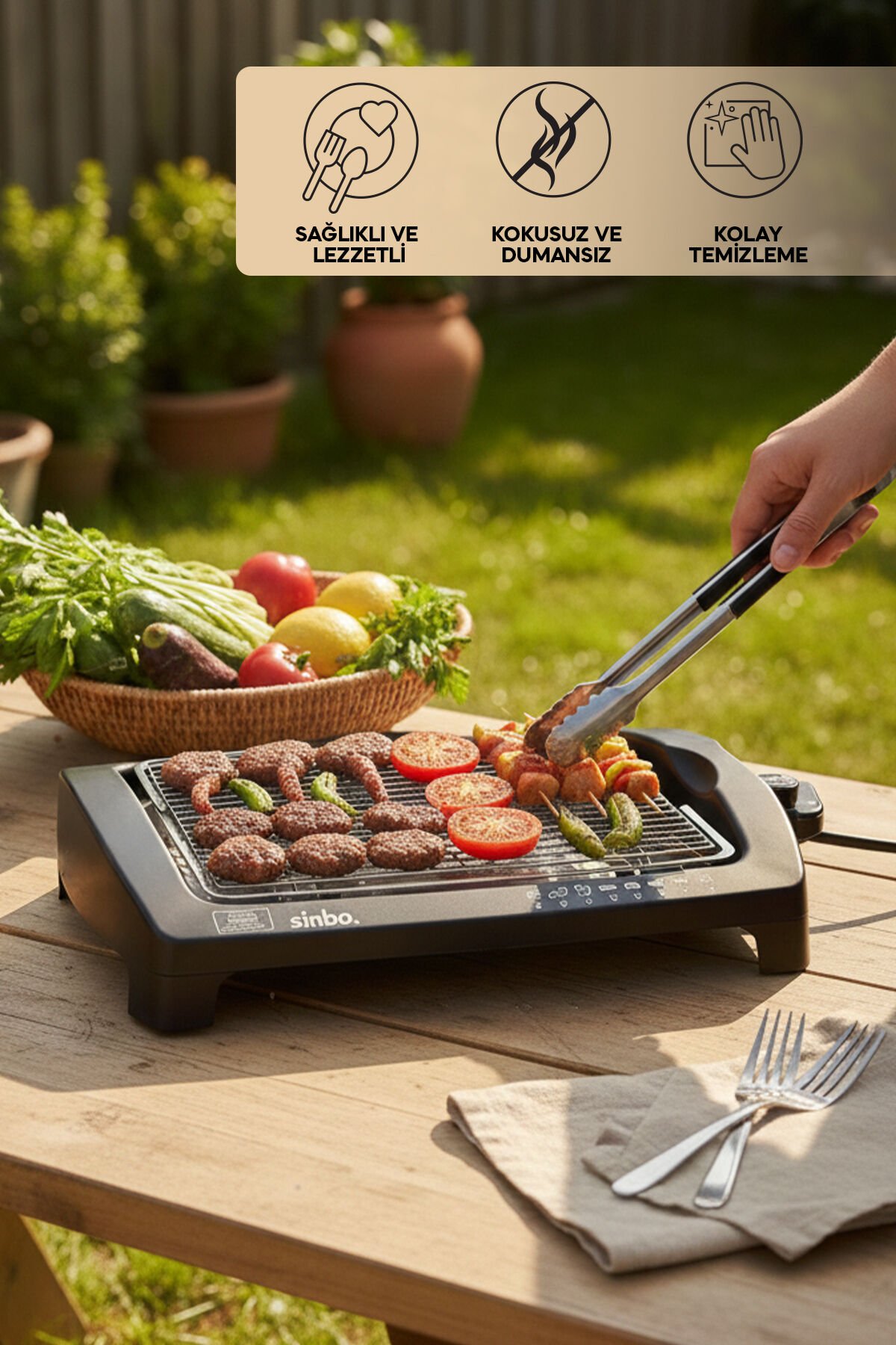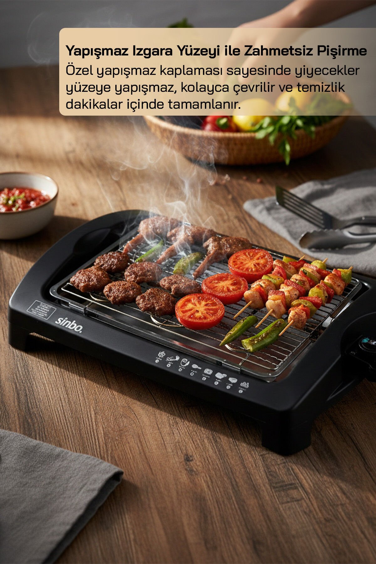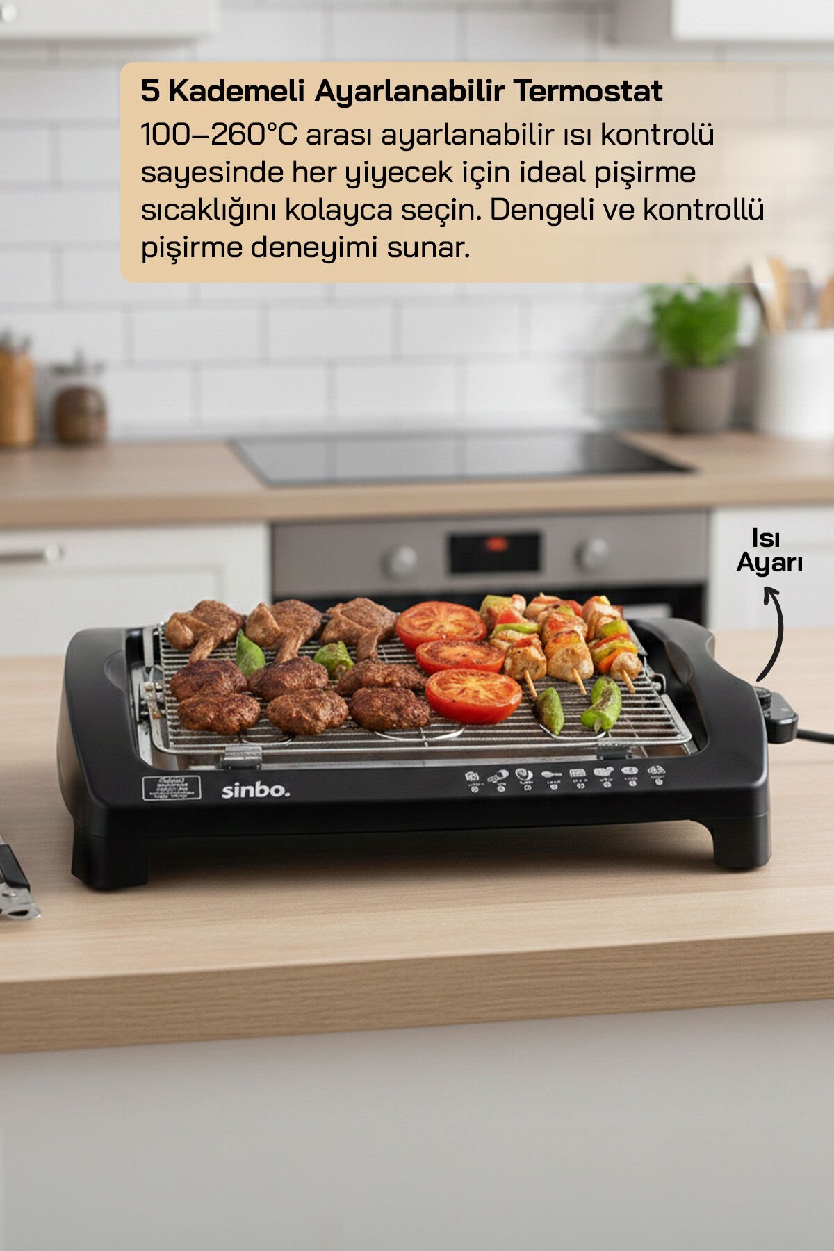 SBG-7102 Elektrikli Izgara;Yapışmaz ızgara plakası ve tepsi;Çıkarılabilir termostat ünitesi;100–260°C arası ayarlanabilir sıcaklık;5 kademeli termostat ayarı;Çıkarılabilir yağ damlama tepsisi;Kokusuz ve dumansız ızgara özelliği;Bulaşık makinesinde yıkanabilir parçalar;Sağlıklı ve lezzetli pişirme;Kolay temizlik
