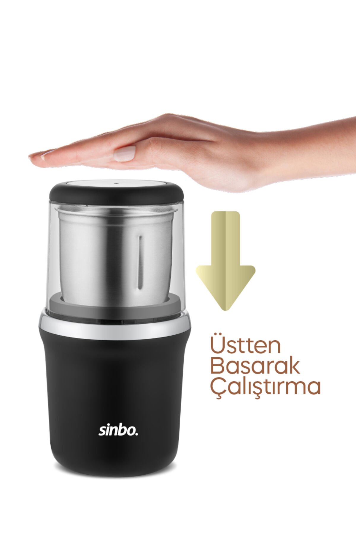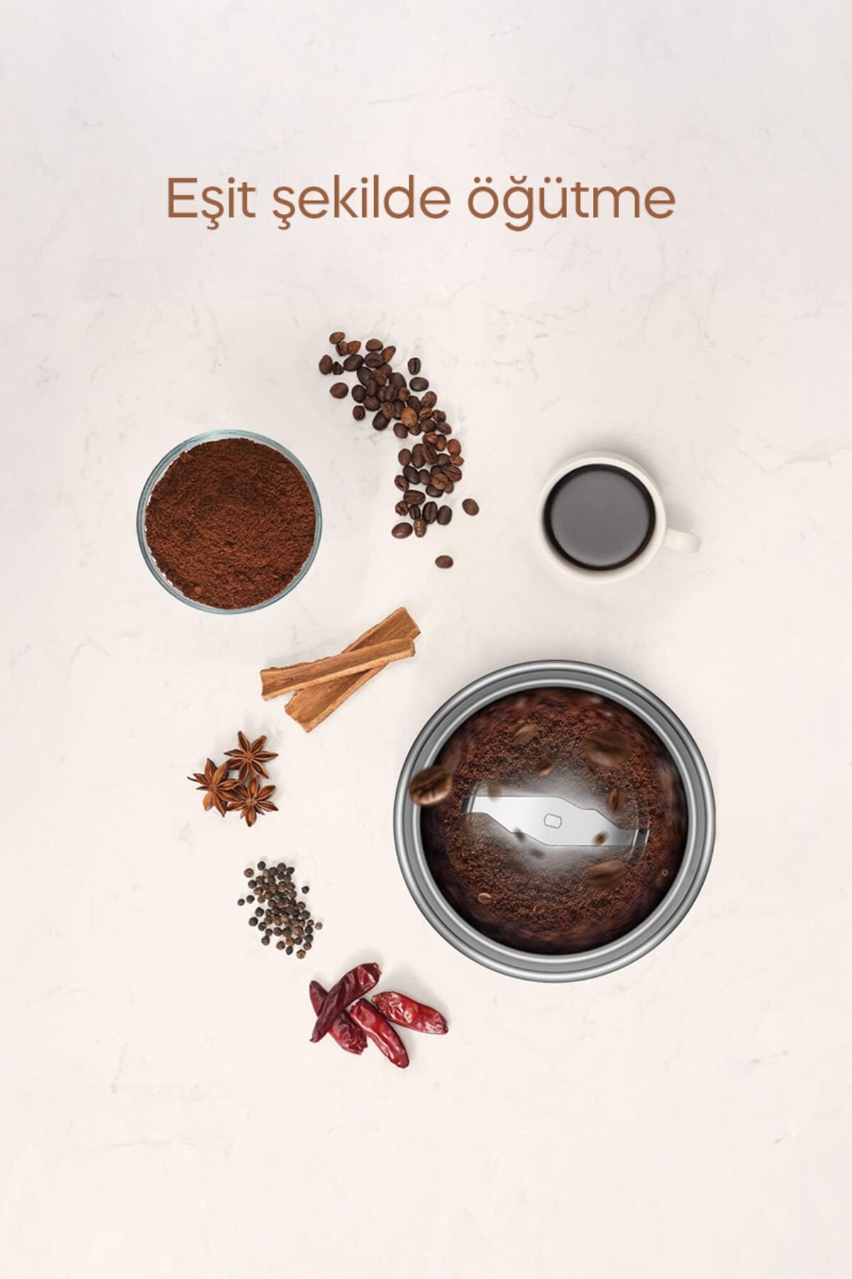 KAHVE & BAHARAT ÖĞÜTÜCÜ •200W Güçlü motor •100 gr öğütücü kapasitesi •Paslanmaz çelik öğütme haznesi •Paslanmaz çelik öğütücü bıçakları •Şeffaf öğütücü kapağı •Kablo saklama yuvası •Emniyet sistemi •Kaymayı önleyen lastik ayaklar