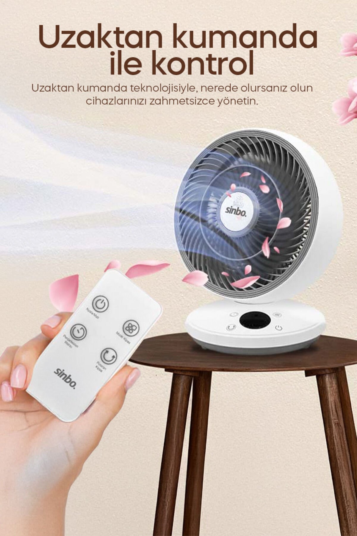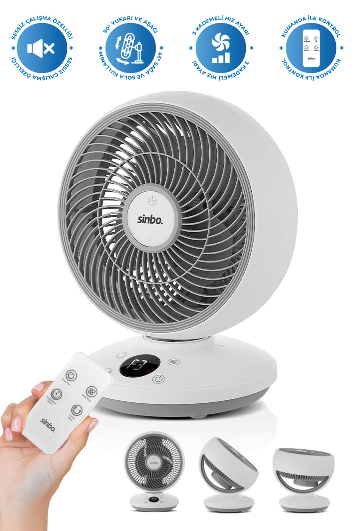 - Masaüstünüzde şık ve işlevsel bir çözüm sunan SF-7702 masaüstü kumandalı fan, çalışma alanınızı serin tutar.; - Enerji verimliliği konusunda dikkat çeken A enerji sınıfına sahip bu fan, elektrik faturalarınızda tasarruf sağlar.; - 2 yıl süreyle resmi distribütör garantisi altında olan SF-7702, güvenle kullanım imkanı tanır.; - Yetkili servis desteği ile tamir edilebilir yapısı sayesinde uzun ömürlü bir kullanım vaat eder.; - Zarif beyaz rengiyle her türlü ofis veya ev dekorasyonuna kolayca uyum sağlar.; SINBO SF 7702 MİNİ FAN Uzaktan kumanda ve dokunmatik düğme ile Salınımlı fan ;• Sessiz çalışma ;• Dakikada 2400 RPM dönme hızı ;• Uzaktan kumanda ile kolay kullanım ;• Dokunmatik düğme kontrolü ;• 3 Kademeli hız ayarı ;• Yüksek salınımlı fan ;• 150 mm fan çapı ;• Kolayca duvara asılabilir ;• 90° yukarı ve aşağı manuel ayarlama ;• 45° otomatik olarak sola ve sağa hareket edebilir ;• Koku ekleme yuvası;• AC220-240V, 50/60Hz, 25W