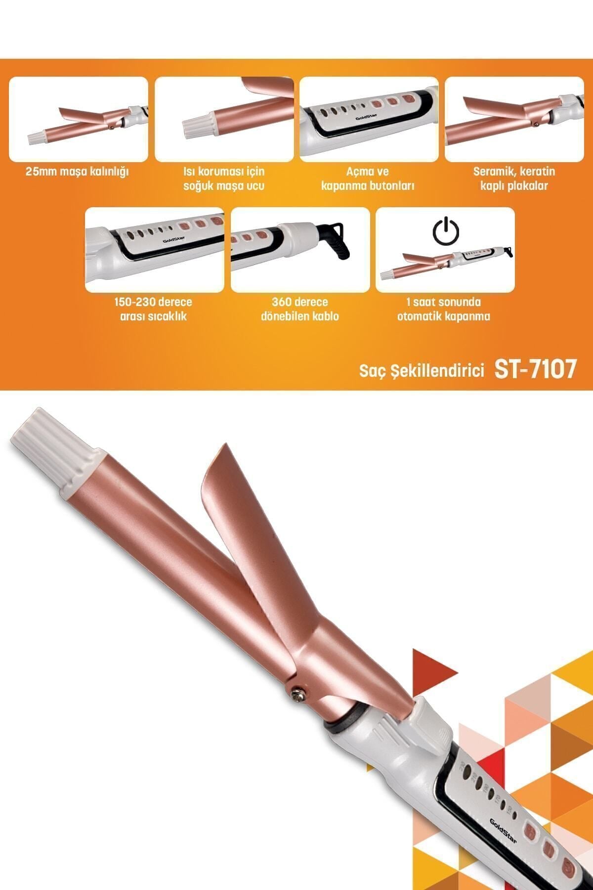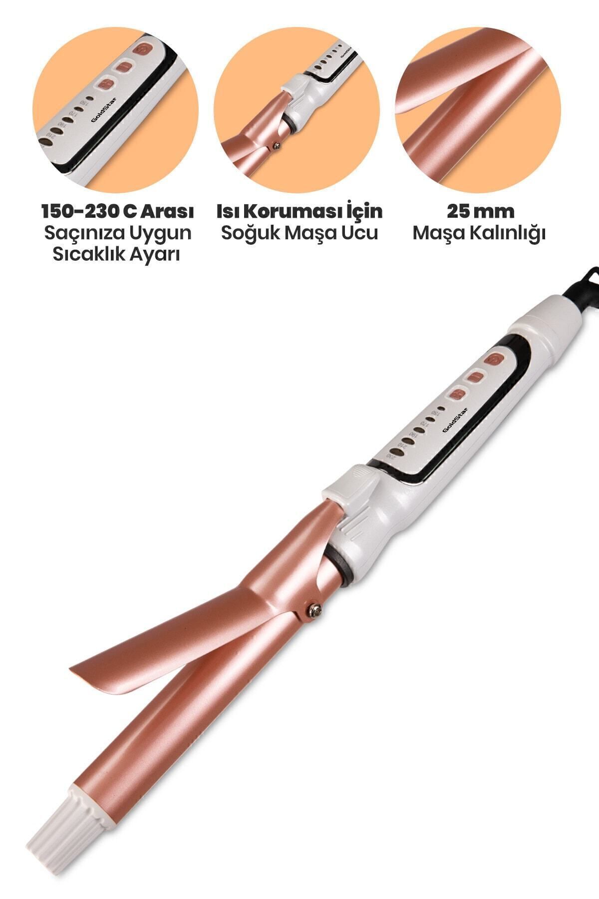 - 230 dereceye kadar ısıtma kapasitesiyle, saçlarınıza istediğiniz şekli kolayca verebilirsiniz; - Kalın bukleler yaratmak için özel olarak tasarlanmış yapısıyla, hacimli ve göz alıcı saç modelleri elde edebilirsiniz; - Dijital ekran sayesinde sıcaklık ayarlarınızı rahatlıkla kontrol edebilir ve istediğiniz ısıyı kolayca seçebilirsiniz; - Otomatik kapanma özelliği ile güvenliğinizi ön planda tutar ve enerji tasarrufu sağlar; - Seramik plaka teknolojisi sayesinde saçlarınıza eşit ısı dağılımı sağlayarak, daha az hasarla parlak ve pürüzsüz sonuçlar elde edersiniz;