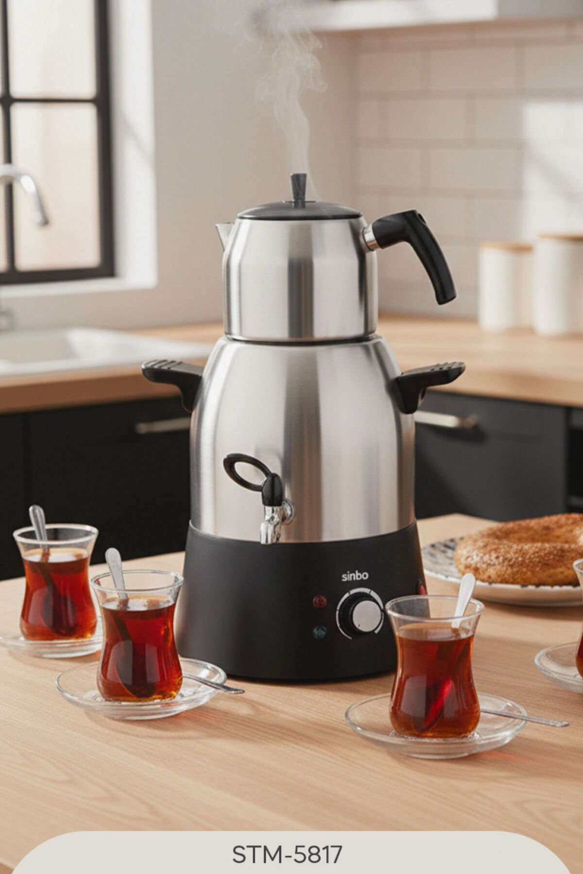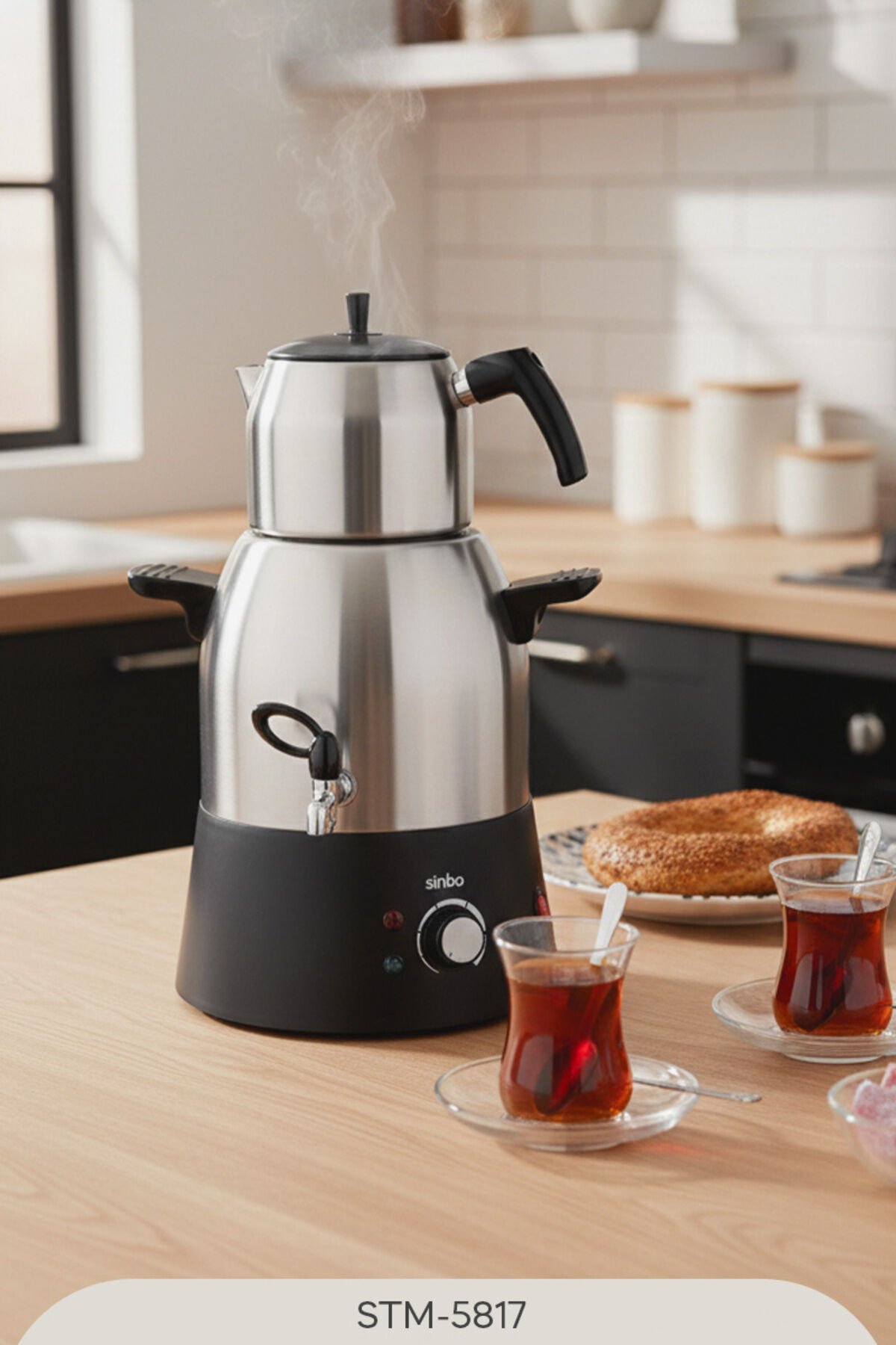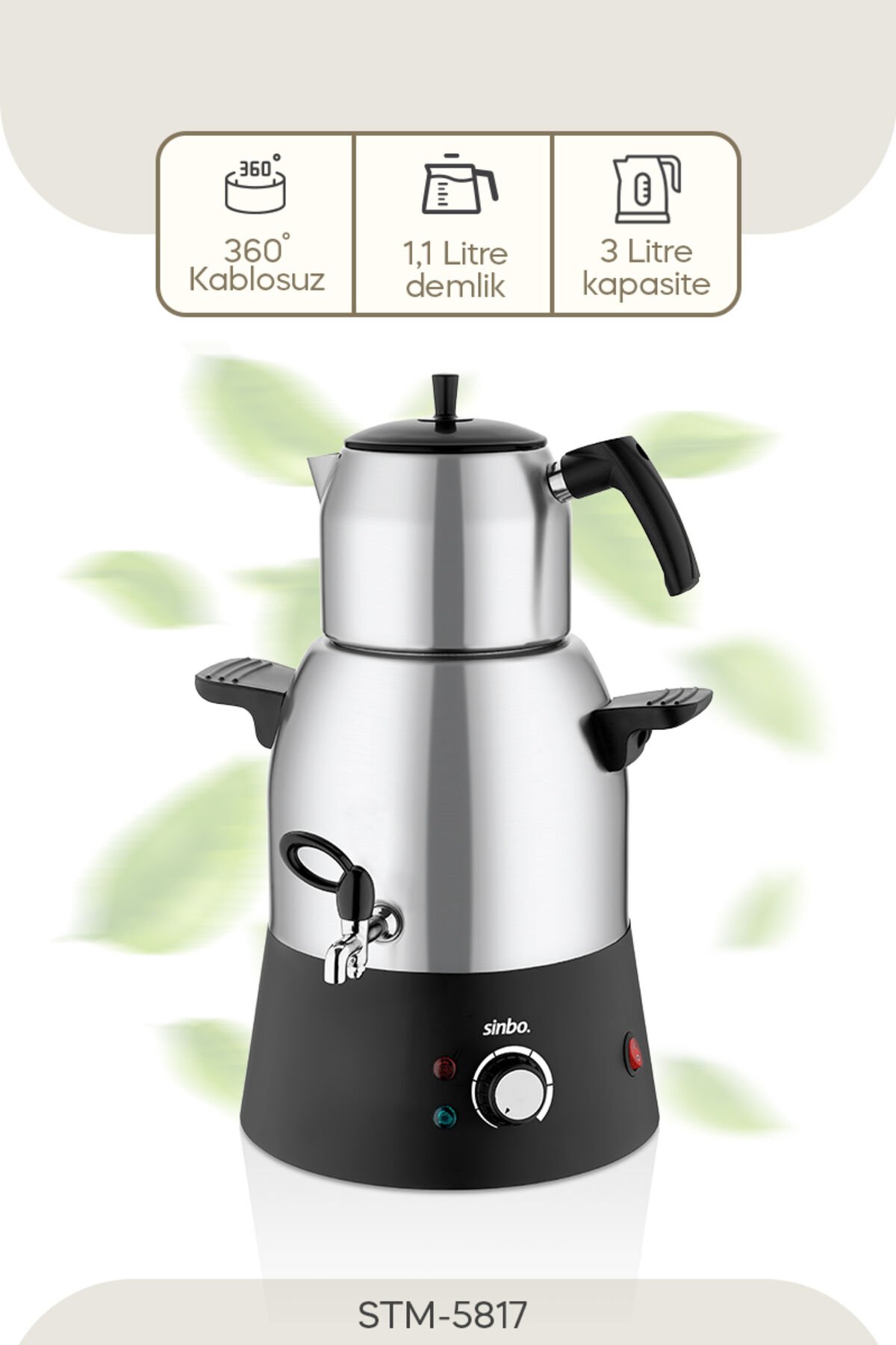 Sinbo STM-5817 2000 W Çelik Demlikli Semaver Sinbo STM-5817 Çay Makinesi; geniş kapasitesi, güçlü özellikleri ve modern tasarımıyla dikkatleri üzerinde topluyor.; Güçlü motoru sayesinde kısa zamanda suyu ısıtıyor ve lezzetli çaylar yapabilmenize olanak tanıyor.; Modern tasarımıyla da mutfağınıza şıklık ve zarafet katıyor ve her açıdan beklentilerinizi karşılayabiliyor.; Uzun ömürlü oluşu, güçlü performansı, geniş kapasitesi ve çok daha fazlasıyla Sinbo STM-5817 Çay Makinesi, en iyi yardımcılarınızdan biri hâline geliyor.; Sinbo STM-5817 Çay Makinesinin Sunduğu Faydalı Özellikler Ürün, sahip olduğu çay filtresi sayesinde lezzetli ve yumuşak içimli çaylar demleyebilmenize olanak tanıyor.; 3 litre su ısıtıcı kapasitesi ve 1,1 litre demlik kapasitesi sayesinde tüm misafirlerinize yetecek kadar çay demleyebilmenize imkân veriyor.; Üründe yer alan kaynama göstergesi, kontroller yapabilmenizi sağlıyor.; Bu sayede kontrol daima sizin elinizde oluyor.; Kullanılmadığı zamanlarda otomatik kapanma özelliğini devreye sokuyor.; Bu sayede enerji tasarrufuna katkı sağlanıyor.; 2000 W DC güce sahip olan ürün, suyu dakikalar içinde kaynatıyor.; Böylelikle artık beklemenize gerek kalmıyor.; Paslanmaz çelik yapısı sayesinde Sinbo Çay Makinesi, uzun ömürlü bir kullanım imkânını sunuyor.; Ürünün Teknik Özellikleri Güç: 2000 W Kapasite: 3 litre su ısıtcısı - 1,1 litre demlik Renk: Siyah Demlik Malzemesi: Çelik Gövde Malzemesi: Çelik Otomatik Kapanma: Var Sinbo Markası Hakkında 20 yıllık başarılı bir geçmişe sahip olan Sinbo markası, faaliyetlerine Türkiye'de başlamıştır.; Türkiye'nin en önemli küçük ev aletleri markalarından biri olan Sinbo, kurulduğu yıldan itibaren kısa zamanda büyük başarılara da imza atmıştır.; Kullanıcı sayısını büyük ölçüde artırmış ve dünya genelinde de tanınan bir marka olmayı başarmıştır.; Sinbo, şimdilerde ise 80'e yakın ülkeye ihracat yaparak bir dünya markası olma yolunda emin adımlarla ilerleye devam ediyor.; • 3 L’ lik paslanmaz çelik gövde • 1,1 L ’lik paslanmaz çelik demlik • Paslanmaz çelik gizli rezistans • Termostatlı ısı kontrolü ile sıcak tutma • Aşırı ısınma ve susuz çalışmayı önleyen emniyet sistemi • Açma/Kapama düğmesi • Kaynama ve sıcak tutmayı gösteren gösterge ışıkları • 2000 Watt • 2 yıl garantili Çay Filtresi Var Demlik Kapasitesi (L) 1,1 Demlik Malzemesi Çelik Gövde Malzemesi Çelik Güç (W) 2000 Kaynama Göstergesi Var Otomatik Kapanma Var Renk Inox Su Isıtıcı Kapasitesi (L) 3 Su/Kireç Filtresi Yok Susuz Çalışma Emniyeti Yok Bu İlan ENTEGRA Entegrasyon Sistemleri ile Listelenmiştir