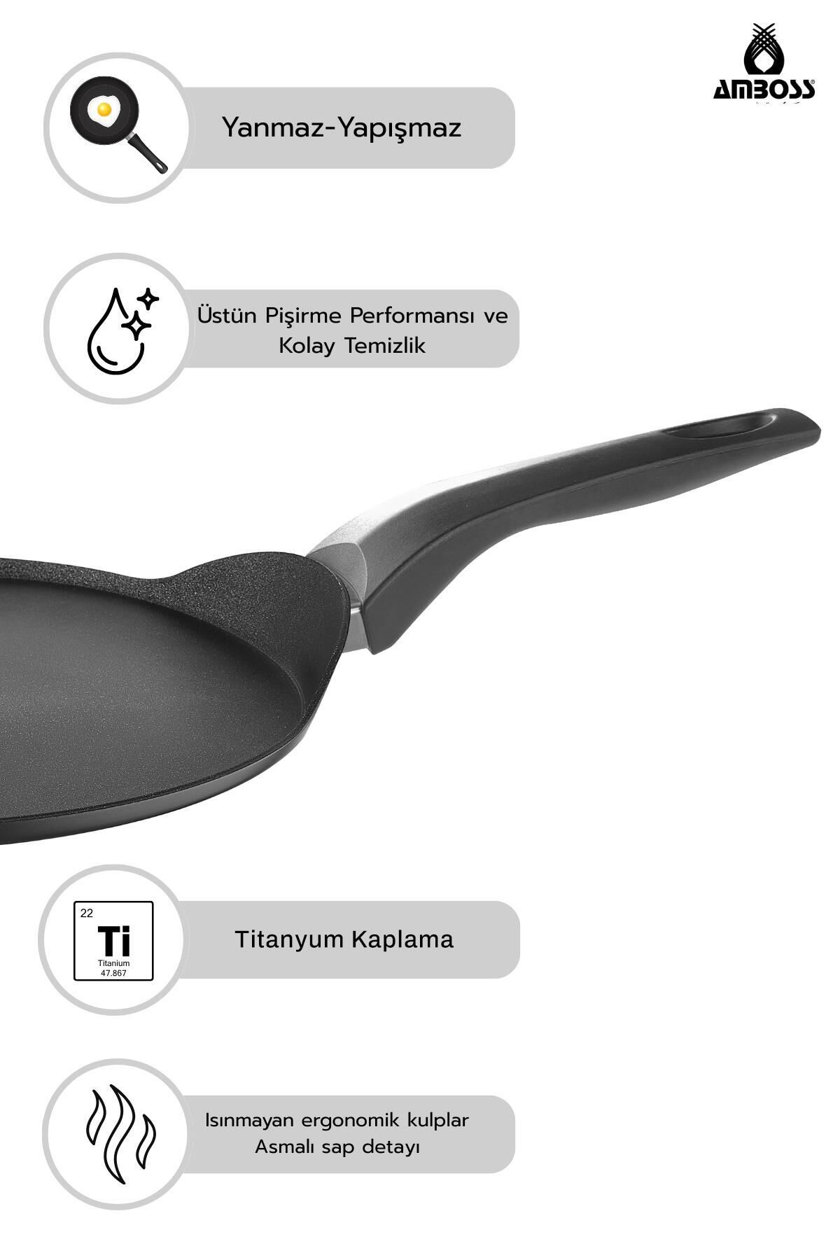 Amboss Storm 30 cm Krep Tavası Ürün Bilgisi Darbeye ekstra dayanıklı gövde ; 3 katlı titanyum kaplama ; Blue Diamond Titanyum Tavası; ; 30 cm ; Gelişmiş teknoloji ile üretilmiştir.; ; Çelikten hafiftir ve 3 kat daha sağlamdır.; ; PFOA içermez ; Ürün Hakkında Çizilmeye darbeye karşı mukavemeti çok yüksektir.; Yapısı gereği yanmaz, yapışmaz bir özelliğe sahiptir.; Isıyı çok iyi ilettiği için çok daha lezzetli yemekler yapabileceksiniz.; Ürünlerimizi kullanım kılavuzun da belirtildiği gibi kullanınız ve muhafaza ediniz.