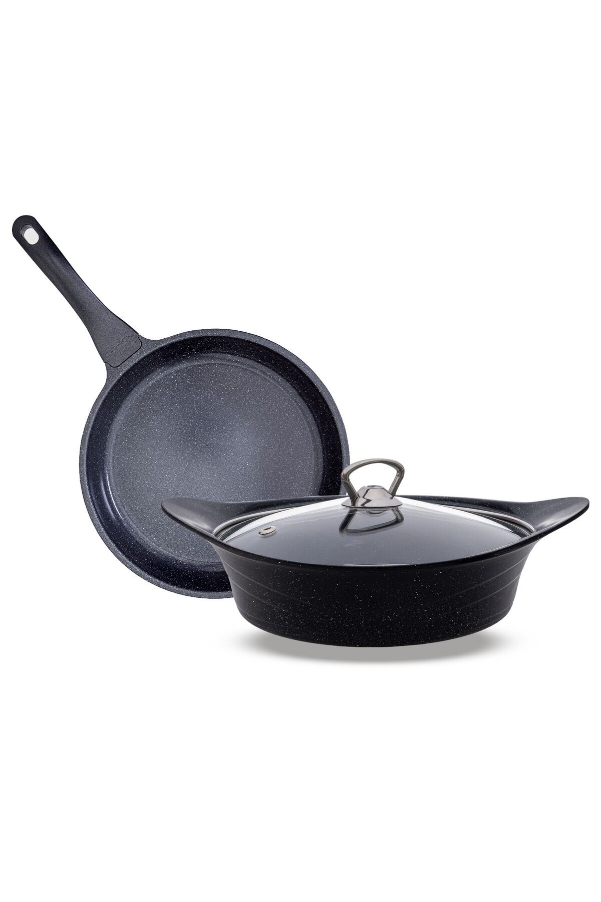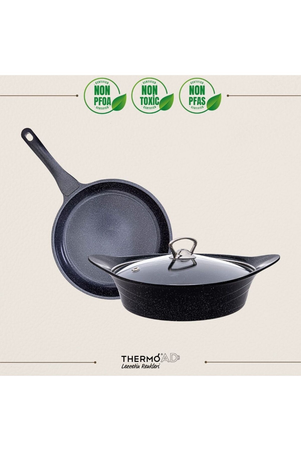 ThermoAD Alüminyum Döküm ürünlerimiz kısa sürede ısınması ile enerji tasarrufu sağlar.;Sıcaklığını uzun süre muhafaza eder.; Isıyı eşit dağıtıp lezzetli ürünler hazırlamanıza yardımcı olur.; Demir döküm ürünlere göre %40 daha hafiftir.; Özellikle kimyasal dayanıklılığı yüksek bir malzemedir.; PFOA ve PFAS İçermeyen ürünlerimiz Özel Granit Kaplıdır.;Yeni Modelimiz ThermoAD Pyro Gri 3 parça Set Ürünlerimiz fırında kullanılabilecek şekilde dizayn edilmiştir.;Set İçeriği;ThermoAD Pyro Gri 26 cm Karnıyarık Tencere;ThermoAD Pyro Gri 26 cm Tava;Kullanım ve Bakım Önerileri;• Ürün ilk kullanımdan önce hafif deterjan ile yıkanmalıdır.;• Bulaşık makinesinde yıkanması uygun değildir.