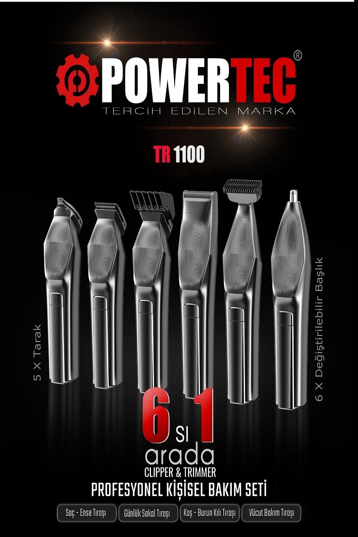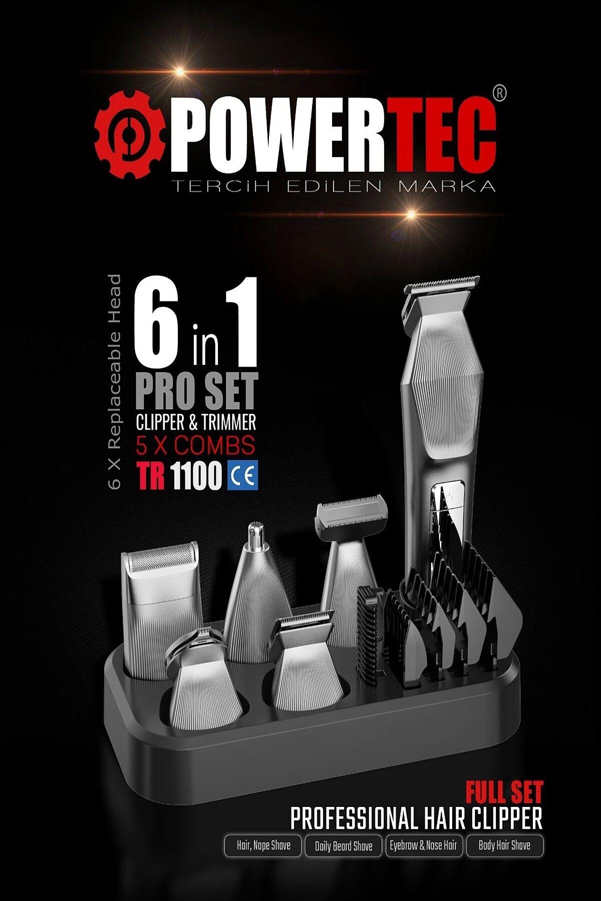 Marka: Powertec;Model:TR-1100;• Kullanım Alanları: Saç,Sakal,Ense,Vücut,Kaş,Burun,Kulak;• Kullanım Şekli: Kablosuz;• Stand : Var;• Şarj Tipi: USB Type-C ( Adaptör Dahil Değil );• RPM: 5700;• Tarak Ölçüleri: Saç: 3-6-9-12 Sakal: Ayarlanabilir 0,5-3mm Günlük: 3-5mm;• Tarak Sayısı: Saç: 4 Sakal: 1 Günlük: 2;• Motor Gücü: 3.7V/DC;• Motor Çalışma Tipi: Tek Kademe;• Pil Özellikleri: 700 mAh;• Batarya Tipi: Gömülü Batarya;• Şarj Bildirim Led: Var ( Dijital );• Çalışma Süresi: 2-3 Saat;• Şarj Süresi: 2-3 Saat