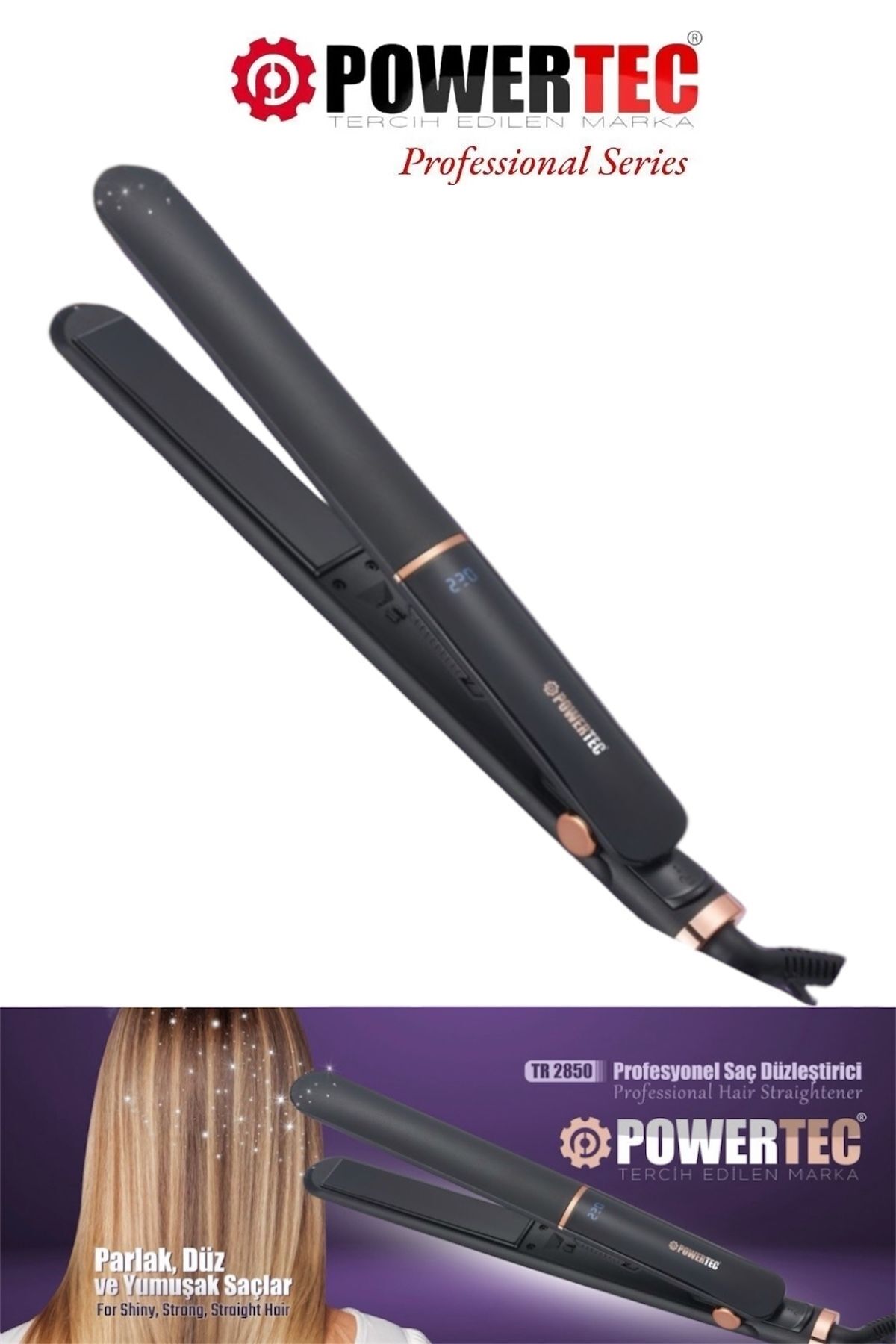 Marka: Powertec;Model:TR-2850;•230°C Sıcaklık Teknolojisi;•Digital Ekran;•Seramik Koruma;•Kablo uzunluğu : 180 cm;•360derece dönebilen kablo;•Anma gücü:60w;•34x4x3cm ürün ölçüsü;•2.4cm plaka yüzeyi