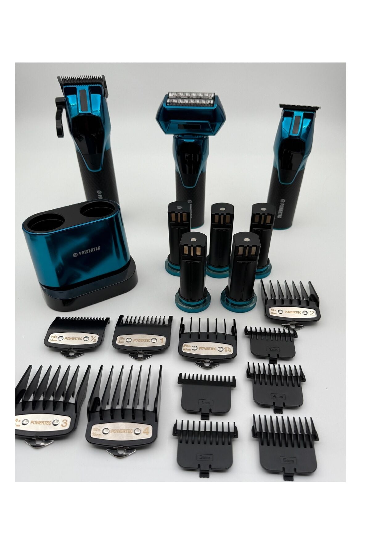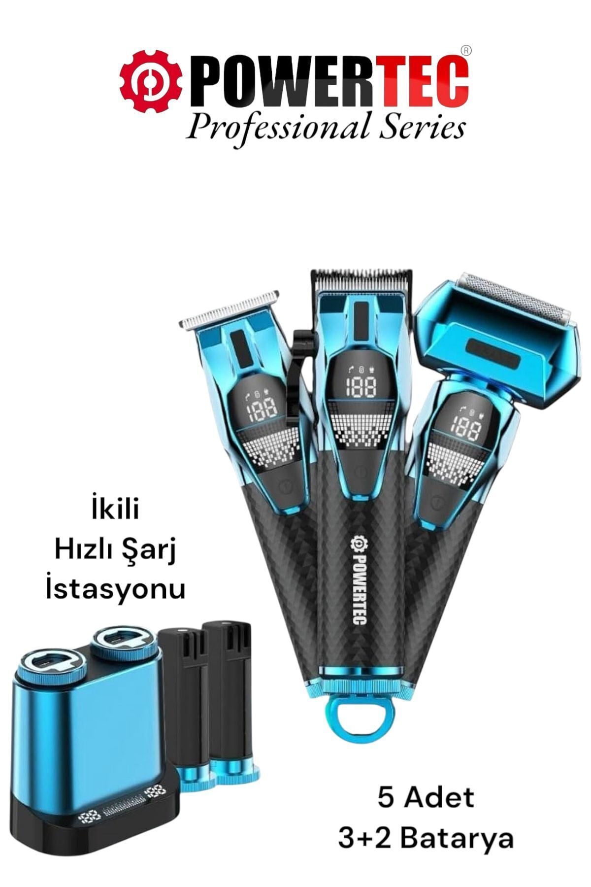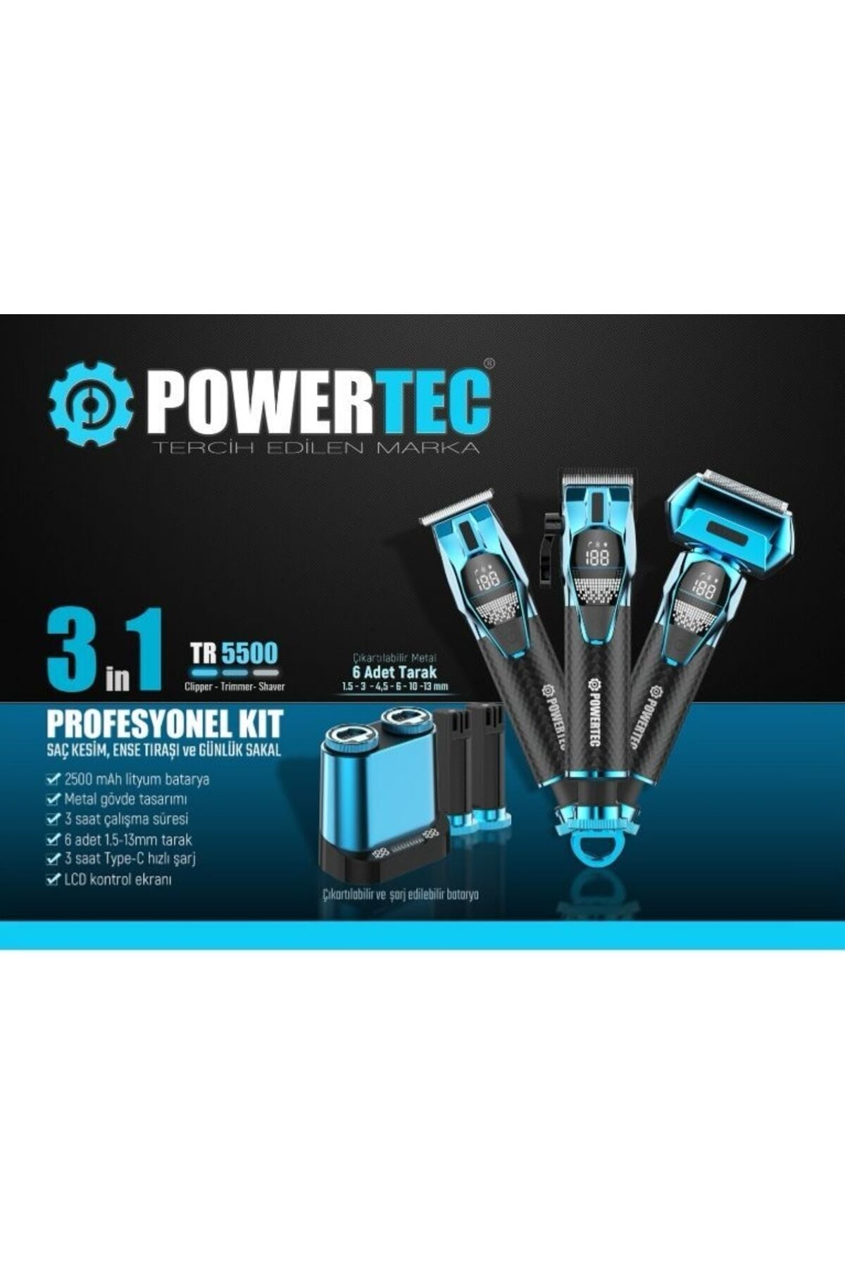 Marka: Powertec ;Model:TR-5500;• Kullanım Alanları: Saç,Sakal,Ense,Vücut ;• Kullanım Şekli: Kablosuz ;• Stand : Var ( Çift Girişli Şarj Standı ) ;• Standlı Standsız Şarj: Var ;• Şarj Tipi: USB Type-C ( Adaptör Dahil) ;• Başlık Tipi: Paslanmaz Çelik ;• RPM: Saç: 6500 Sakal: 5800 Günlük: 6300 ;• Tarak Ölçüleri: Saç: 1,5-3-4,5-6-10-13mm Sakal: 1-2-3-4-5mm ;• Tarak Sayısı: Saç: 6 Sakal: 5 ;• Taraksız Uzunluk Ayarlama: Saç: 0.8-2mm Sakal: 0.1mm Günlük: 0mm ;• Motor Gücü: 3.3V/DC ;• Motor Çalışma Tipi: Tek Kademe ;• Yedek Pil: Var ( 2 Adet ) Toplam 5 adet ;• Pil Özellikleri: 2500 mAh ;• Batarya Tipi: Çıkarılabilir Pil ;• Şarj Bildirim Led: Var ( Dijital ) ;• Çalışma Süresi: 4-5 Saat ;• Şarj Süresi: 4-5 Saat