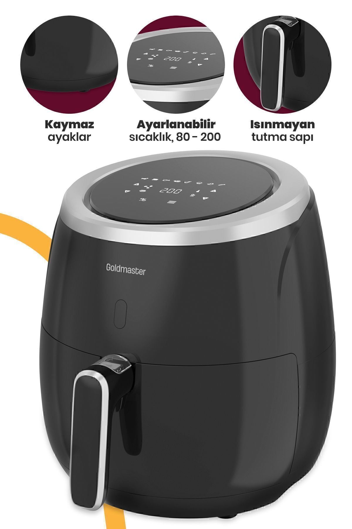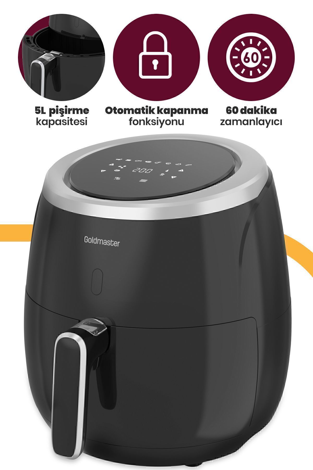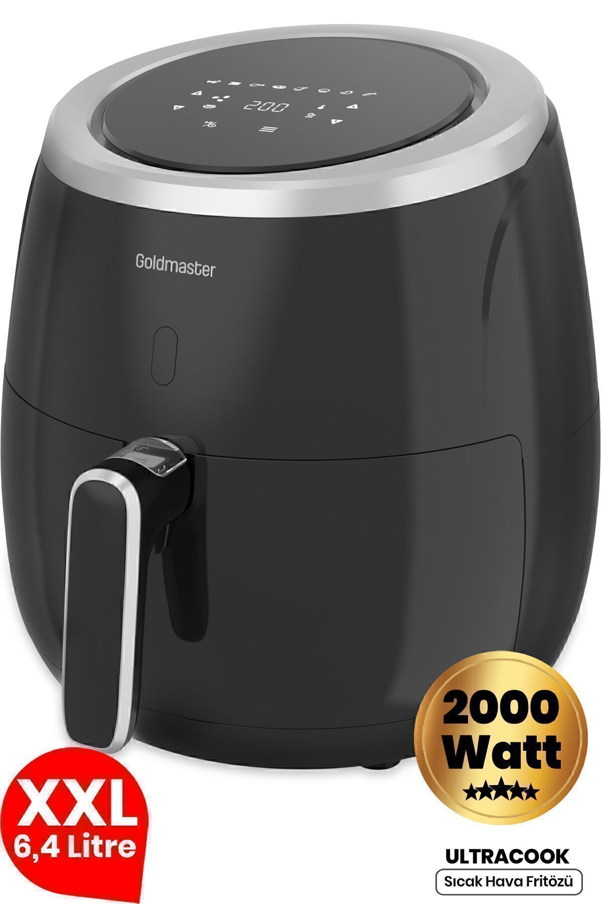 GoldMaster Ultracook 2000 Watt XXL Dokunmatik Yağsız Sıcak Hava Fritözü Ürün Özellikleri • 2000W Performans • Dış Hazne Kapasitesi:6,4L • Pişirme kapasitesi:5L • Dijital sıcaklık ve zaman ayarı • 8 ön ayar menüsü • 80C—200C ayarlanabilir sıcaklık • 60 dakikaya kadar zamanlayıcı • Yapışmaz, çıkarılabilir ve bulaşık makinesinde temizlenebilir pişirme sepeti • Isınmayan tutma kolu • Otomatik kapanma fonksiyonu • Kaymaz ayaklar