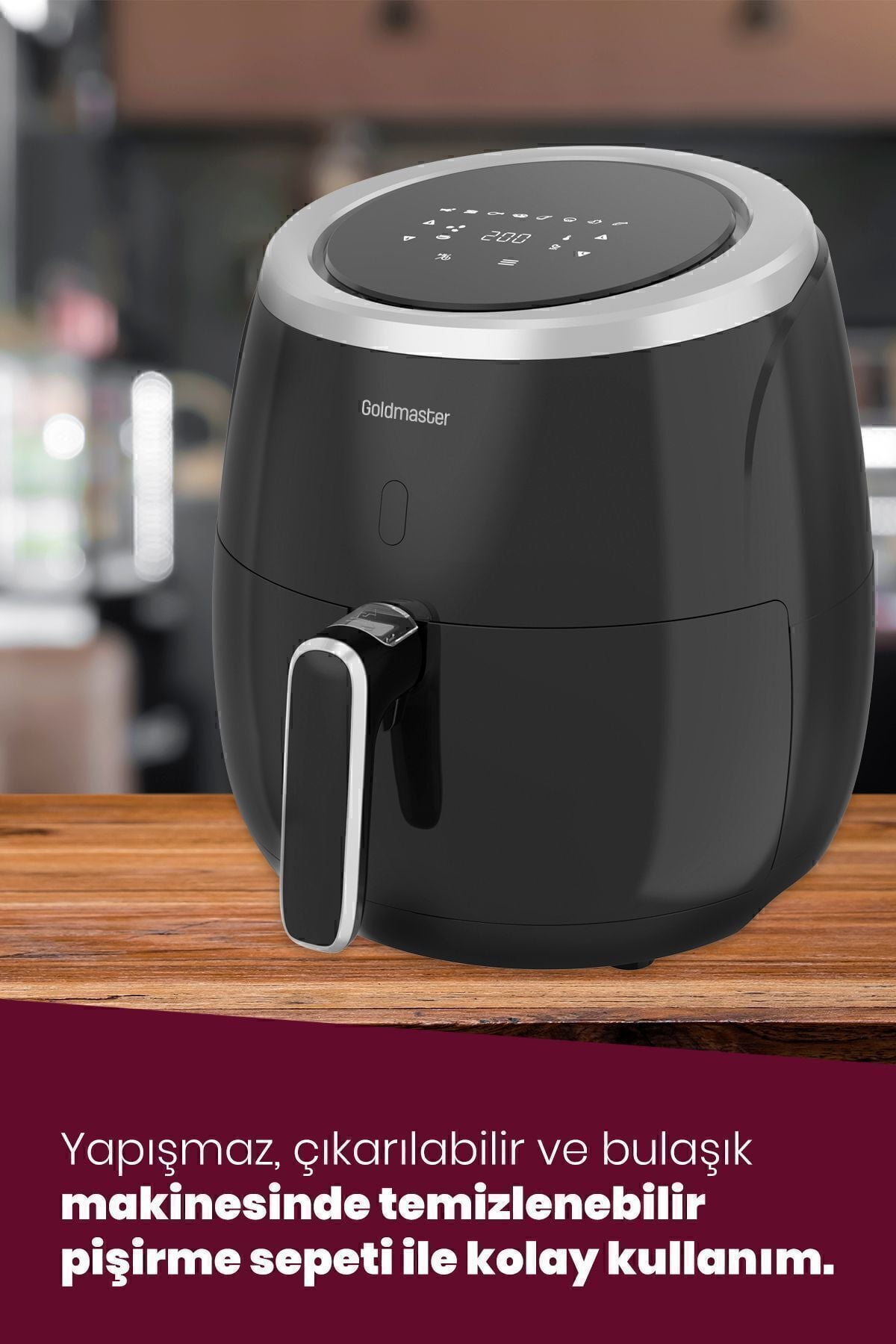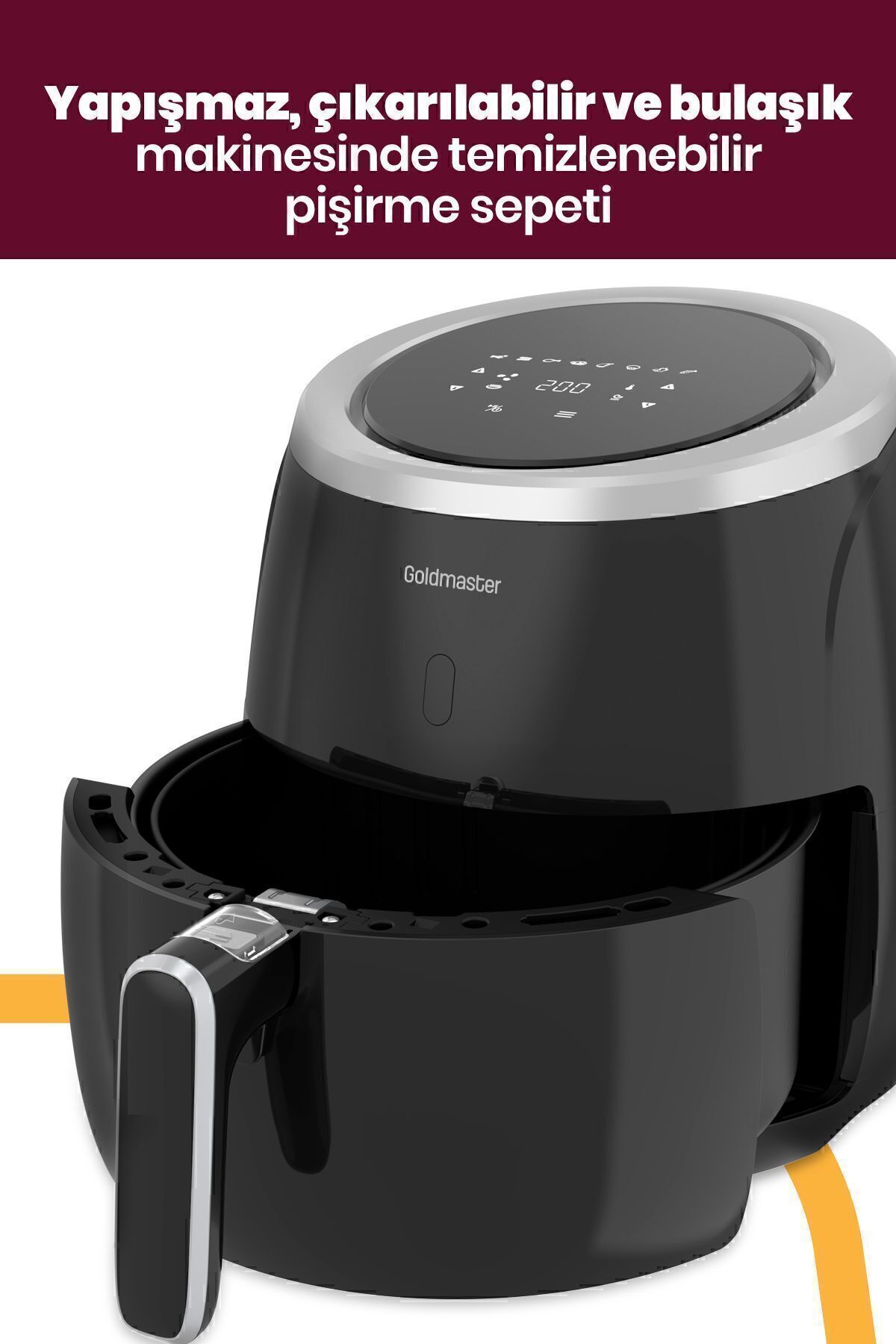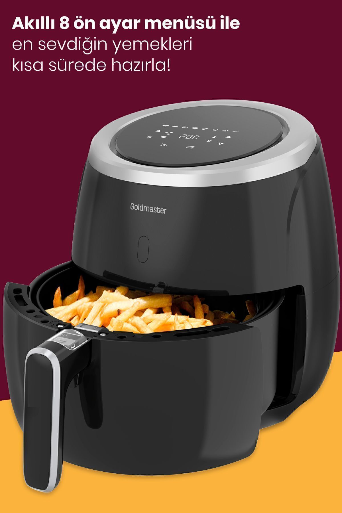 GoldMaster Ultracook 2000 Watt XXL Dokunmatik Yağsız Sıcak Hava Fritözü Ürün Özellikleri • 2000W Performans • Dış Hazne Kapasitesi:6,4L • Pişirme kapasitesi:5L • Dijital sıcaklık ve zaman ayarı • 8 ön ayar menüsü • 80C—200C ayarlanabilir sıcaklık • 60 dakikaya kadar zamanlayıcı • Yapışmaz, çıkarılabilir ve bulaşık makinesinde temizlenebilir pişirme sepeti • Isınmayan tutma kolu • Otomatik kapanma fonksiyonu • Kaymaz ayaklar